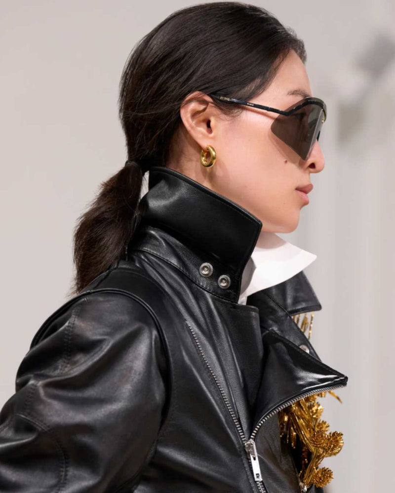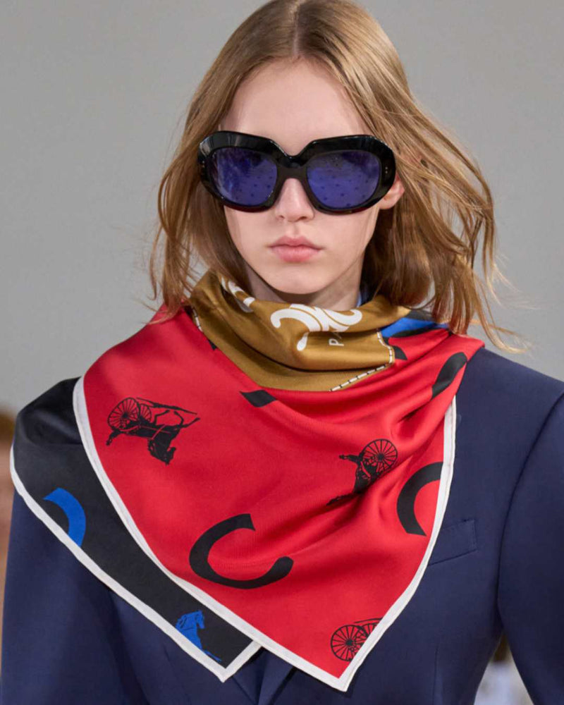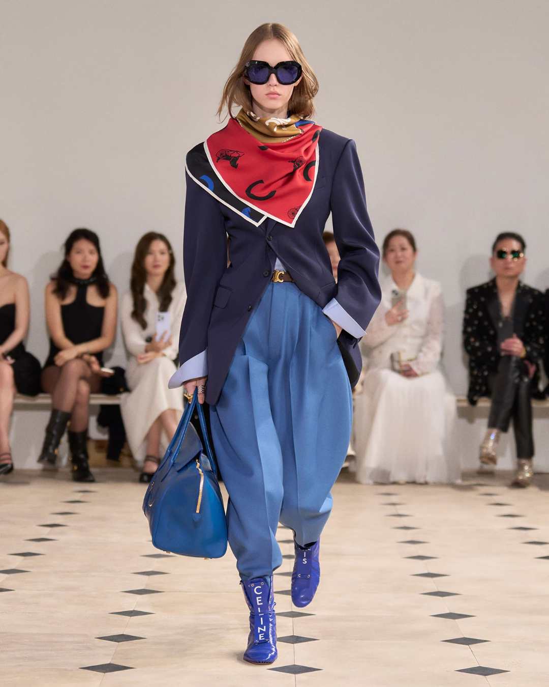 On the runway, the silhouettes hinted at smiles, like those on the bags. Camel blazers deliberately twisted over denim shirts and fitted trousers. Leggings, white jeggings, and equestrian pants revisited the appeal of skinny lines, while wide pleats and cocoon coats added lightness and movement. The collection embodied an active, vital Celine client, someone eager to move through the world. Long coats with padded shoulders, draped parkas, and soft leather biker jackets bridged Paris and New York. Rider’s preppy touch appeared with humor and grace: rugby shirts turned into dresses, red and blue blazers, tartan shirts, and supple leather loafers. For evening, a little black dress and a white gown symbolized the maison’s new duality.