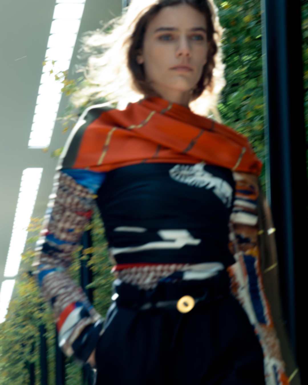On July 6, 2025, under a grey Parisian sky over Rue Vivienne, Michael Rider presented his first show for Celine. The scene felt intimate, like a quiet ceremony filled with anticipation. The courtyard of the historic building housing the maison’s studio and atelier was covered by a vast silk scarf suspended between its walls, a poetic preview of the house’s new codes. The seats were arranged in the shape of the Triomphe, as if Celine’s emblem itself were welcoming a new era. In the front row, the cultural weight of the moment was palpable: BTS V arriving on a Celine bicycle, Kristen Wiig, Naomi Watts and her daughter Kai Schreiber, Alanis Morissette, Jonathan Anderson, Raf Simons, Law Roach, and Anna Wintour. The sound of rain became almost another guest, one that never disrupted the expectation in the air.