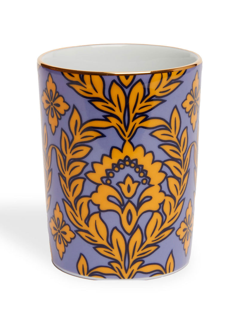 Purple, violet, yellow, porcelain mug with printed leaves, glazed finish, cylindrical design and gold-tone rim.