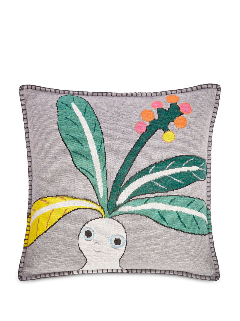 Loewe´s Wool knitted cushion with grey background and multicoloured print. This cushion is part of the LOEWE x Suna Fujita collaboration. With mandrake jacquard motifs, stitched edges, feather filling. Leather patch engraved with LOEWE logo.