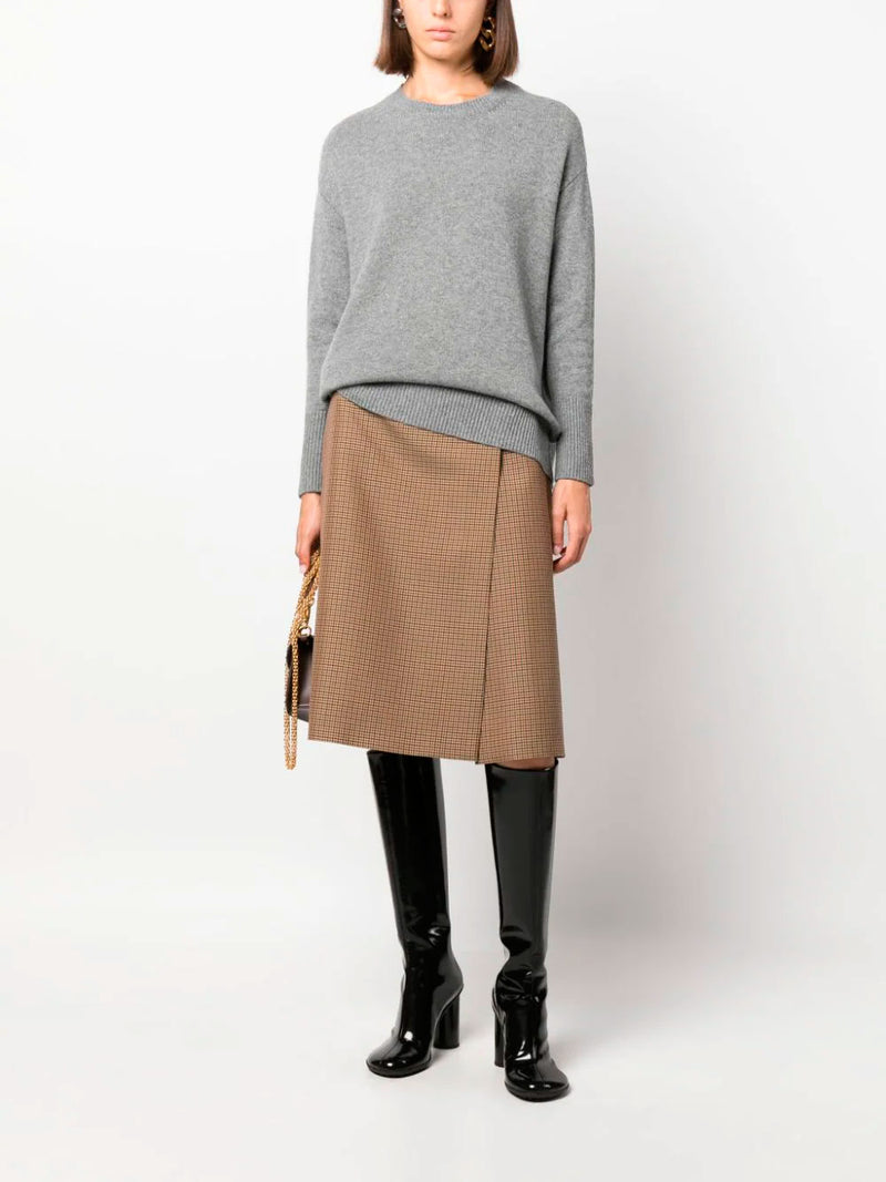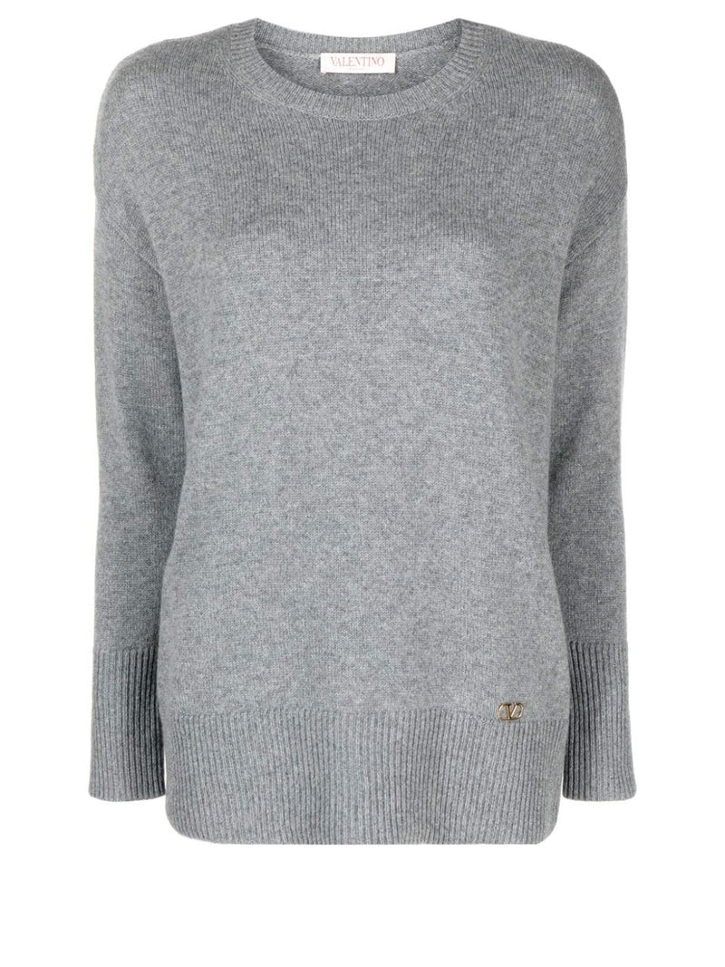 Valentino grey jumper in cashmere with knitted construction and ornamented with signature VLogo in gold-tone to the hem. The wide design features crew neck, long sleeves, straight hem and ribbed cuffs and hem