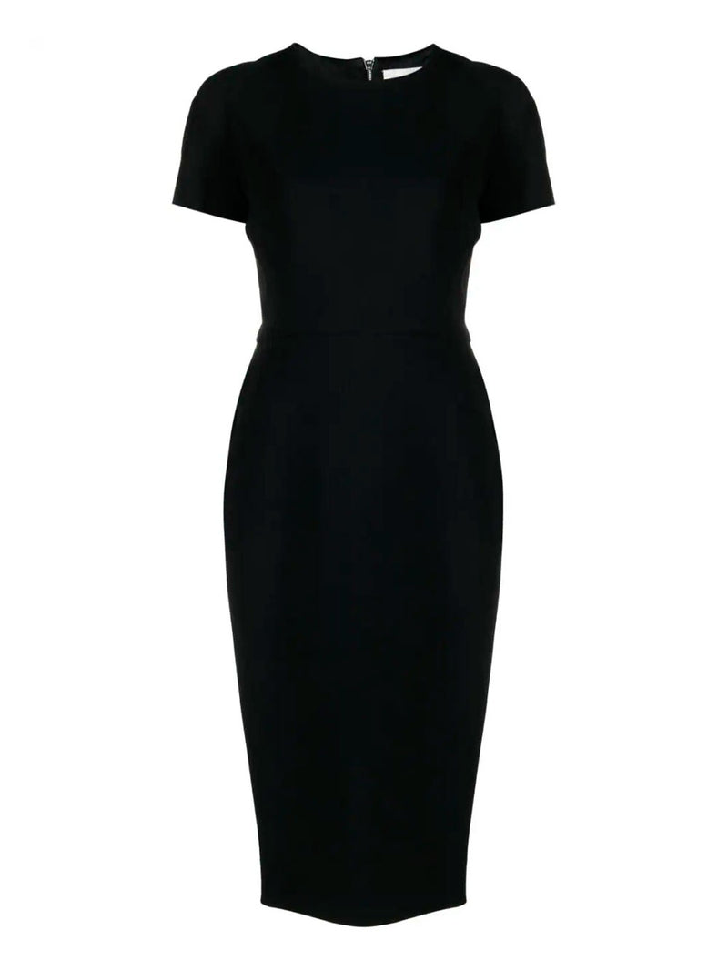 Victoria Beckham´s fitted midi dress with crepe texture. Cut to a sleek silhouette that falls just below the knees and is imagined in a crisp black colour. Featuring round neck, rear two-way zip fastening, short sleeves and rear slit. The back zip runs from the neckline to the bottom.