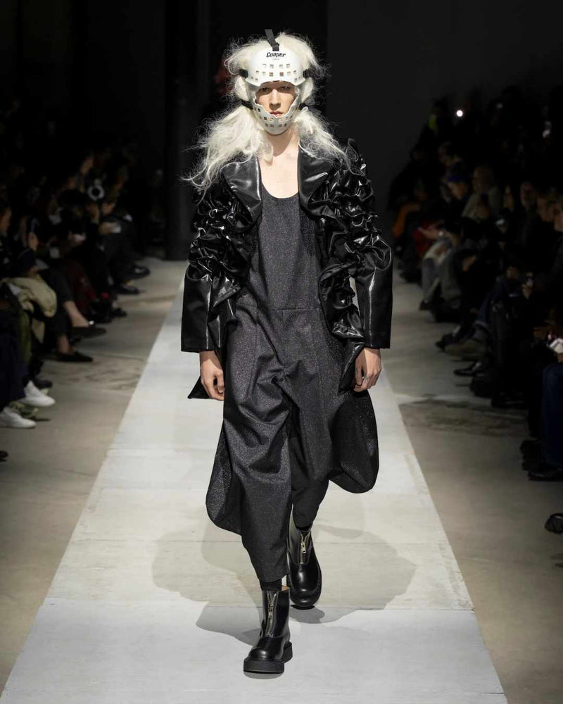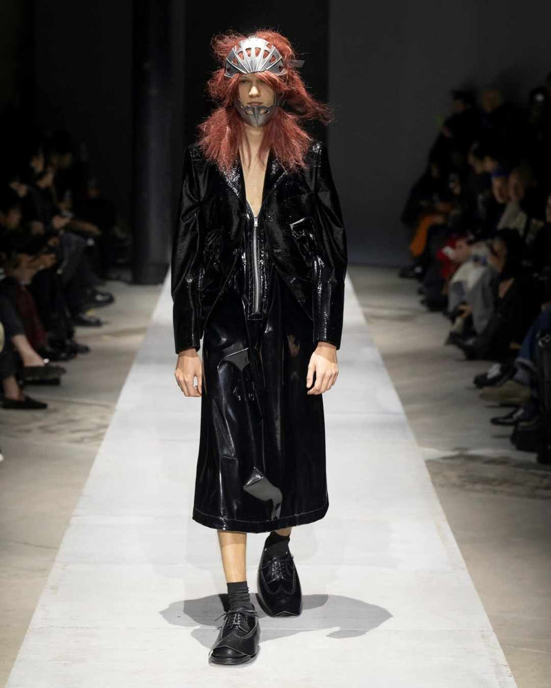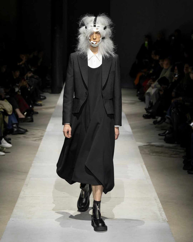 La silueta marca un tono en ocasiones constrictor. Los abrigos se alargan y se envuelven de forma estrecha, abotonados hasta lo alto. Siluetas tubulares e insistentemente verticales alargadas por las proporciones de los altísimos modelos. La sastrería se reduce a su construcción más clásica, pero se afila mediante proporciones nuevas.