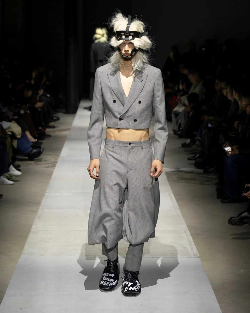 El color sorprende, entre rosa envejecido, malva, verde anís, morados profundos y tonos que nos devuelven a la Miuccia de 2018. Tonos ciertamente inesperados, ligeramente discordantes, pero armonizados. Los accesorios subrayaban la individualidad más que la uniformidad: carteras impuestas en bolsillos demasiado pequeños, cordones de colores, hebillas reutilizadas como cierres de corbata… La armonía clásica del armario masculino se deshacía en manos de Miuccia y Raf.