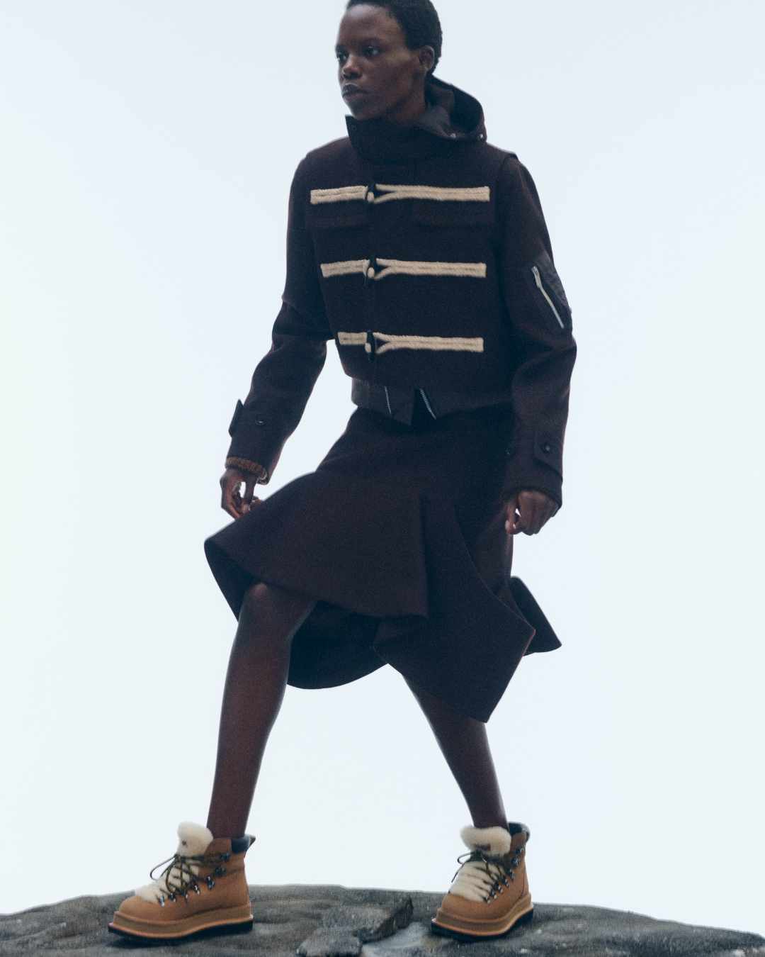 La ropa Sacai reinterpreta prendas clásicas como una camisa blanca, una cazadora vaquera o un vestido plisado, para transformarlas en piezas que oscilan entre formal e informal, clásico y contemporáneo, masculino y femenino. La firma une opuestos: punto y seda, chaquetas y faldas, sastrería y sportswear. No hay límites entre lo formal y lo casual, lo clásico y lo vanguardista.