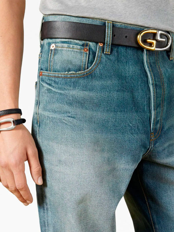 Algunos cuentan con detalles como bajos sin rematar, ofreciendo opciones para cada estilo personal. Los diseños suelen incluir los cinco bolsillos clásicos, costuras en contraste y trabillas para cinturón, detalles que combinan funcionalidad con estética. Sobre estos pantalones, un cinturón Gucci GG es la opción ideal.