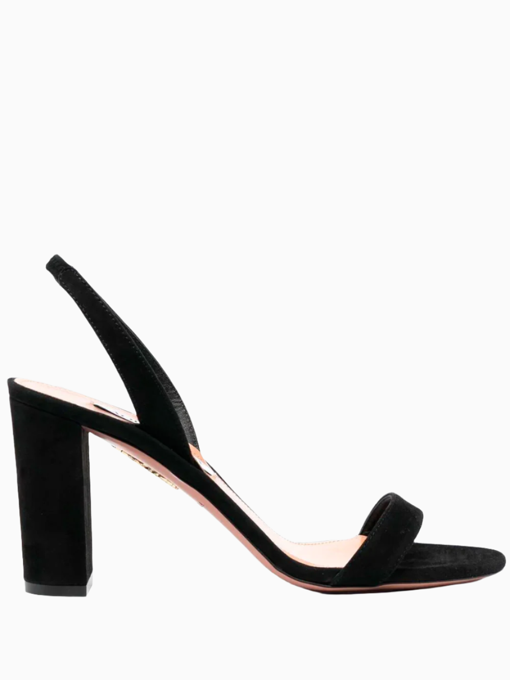 Sandalias de ante negro con tacón de Aquazzura. Con detalle de tiras, puntera redonda, puntera abierta, tira trasera, sin cierre y tacón alto en bloque de 85mm.