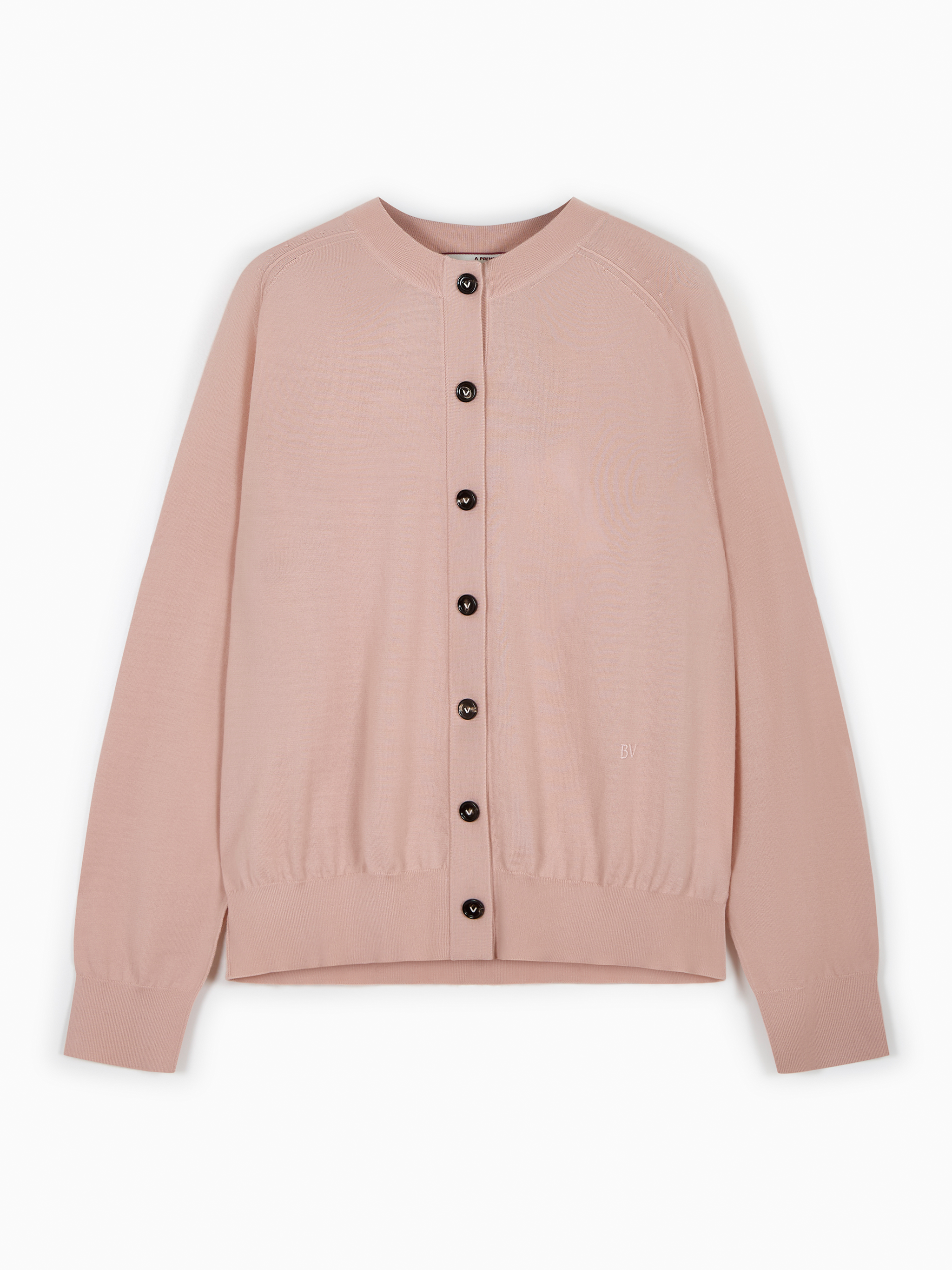 Cardigan de cashmere de Bottega Veneta. Confeccionado en cashmere rosa pálido, con cuello cuadrado y botones en contraste.