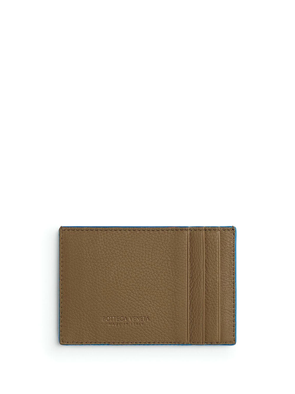 Tarjetero Cassette de Bottega Veneta realizado en piel granulada intreccio en tono agril con bordes contrastados en un profundo tono pacífico. Tres ranuras para tarjetas y un bolsillo central.