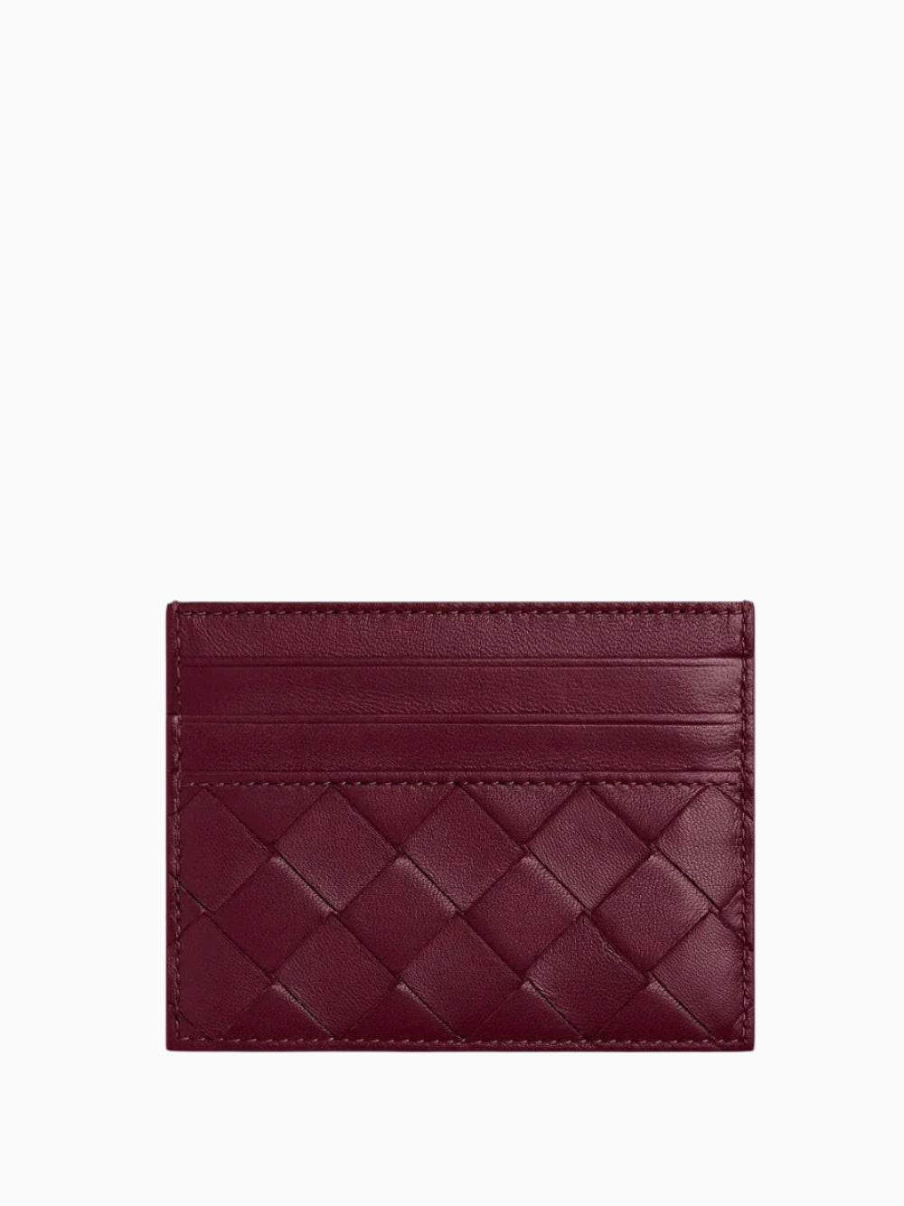 Tarjetero de Bottega Veneta en napa Intrecciato color Barolo. Con seis ranuras para tarjetas y un bolsillo central.