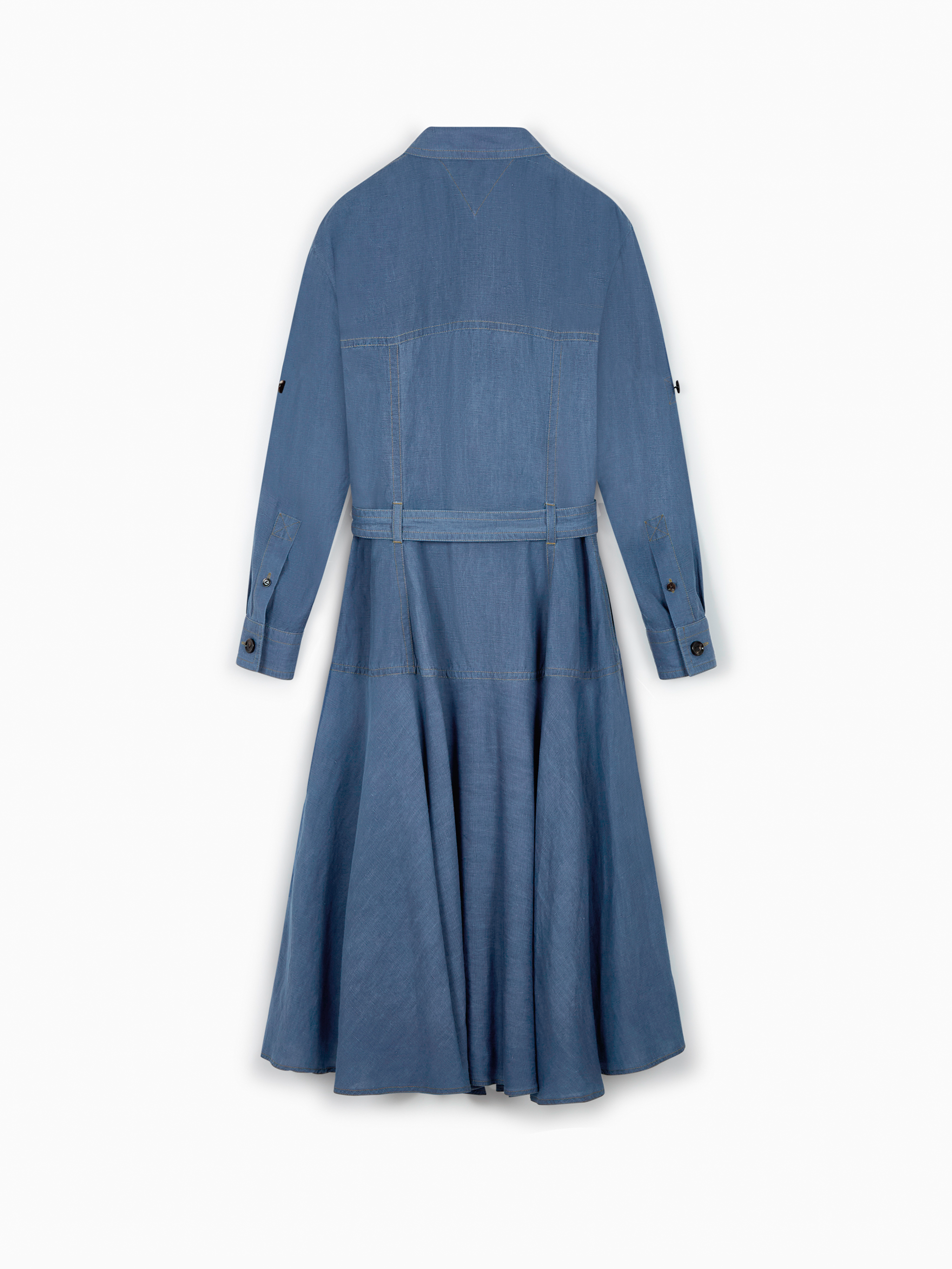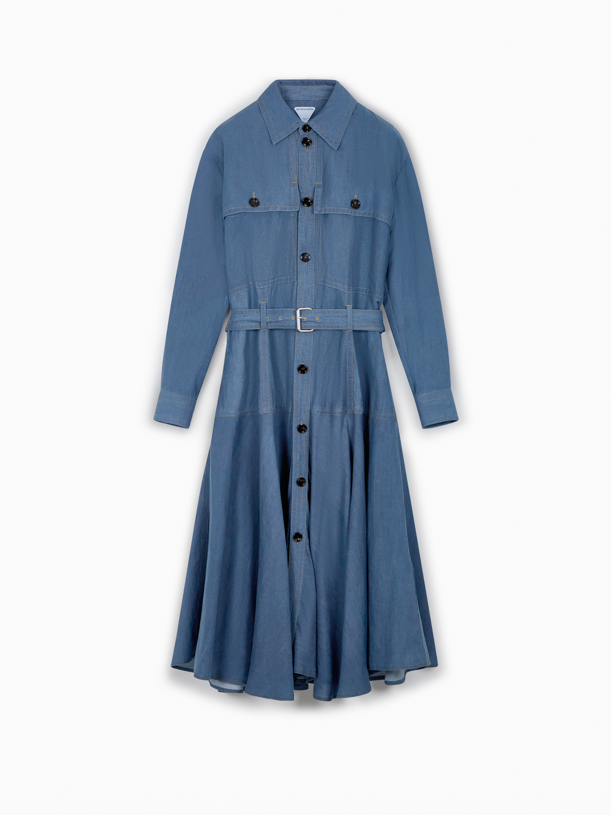 Vestido camisero azul de Bottega Veneta. Confeccionado en una sutil mezcla de viscosa y lino que imita el denim, presenta un corte camisero clásico con mangas largas remangables, cuello abotonado y falda acampanada. Largo medio por debajo de la rodilla, cinturón con hebilla metálica, dos bolsillos en el pecho con solapa y costuras amarillas en contraste.