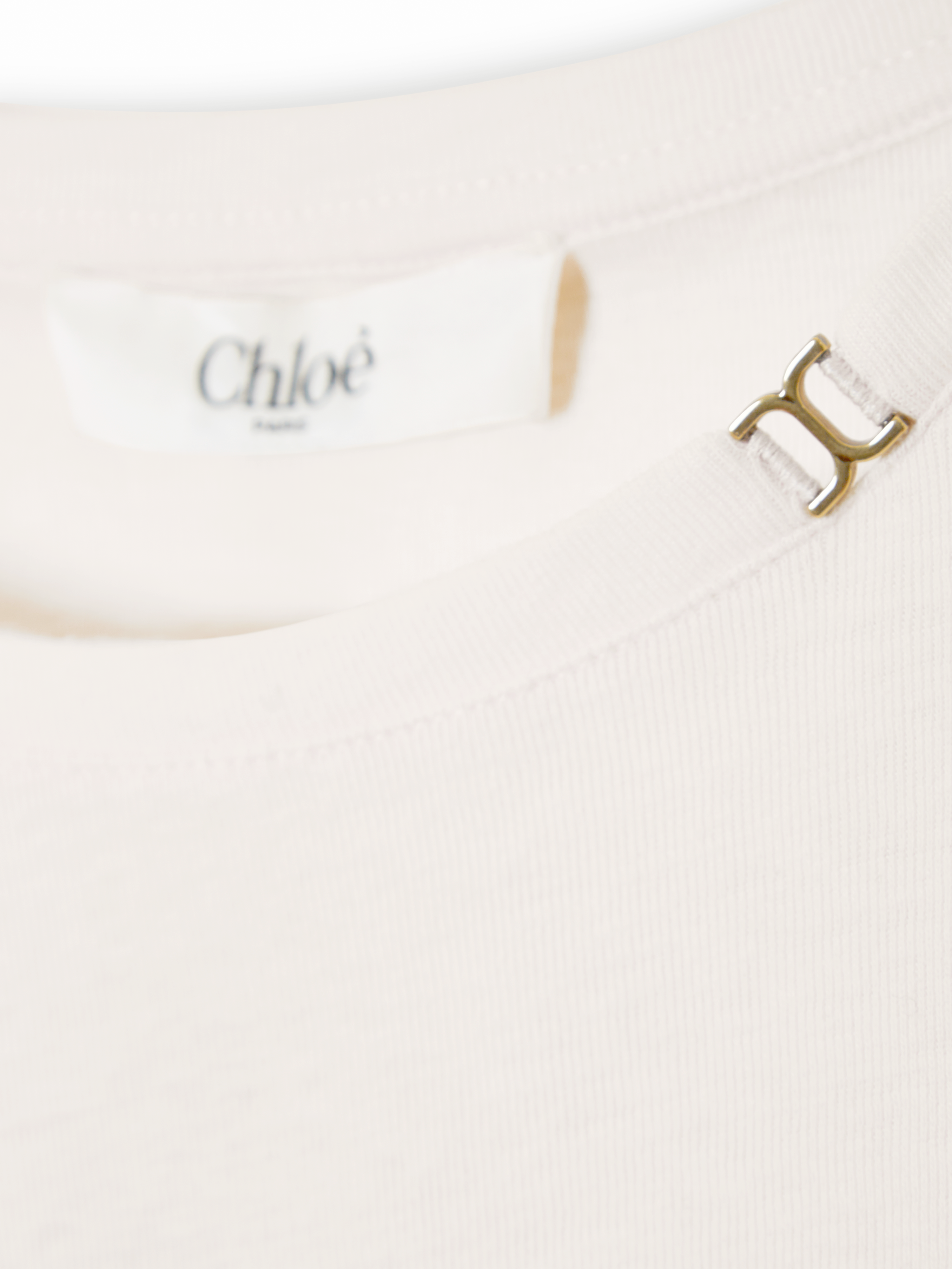 Top de punto de Chloé. Confeccionado en algodón marfil con escote barco, detalle de Marcie en el cuello, mangas hasta el codo y corte entallado.