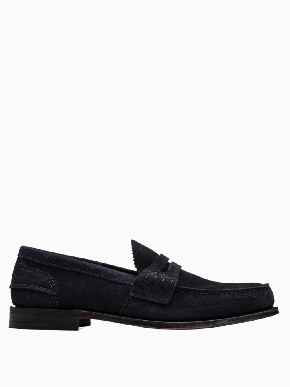 Mocasines Pemberley Rodeo de Chuch's en ante azul marino. Puntera redonda, detalle de ribete, tacón cuadrado bajo y plantilla con logo.