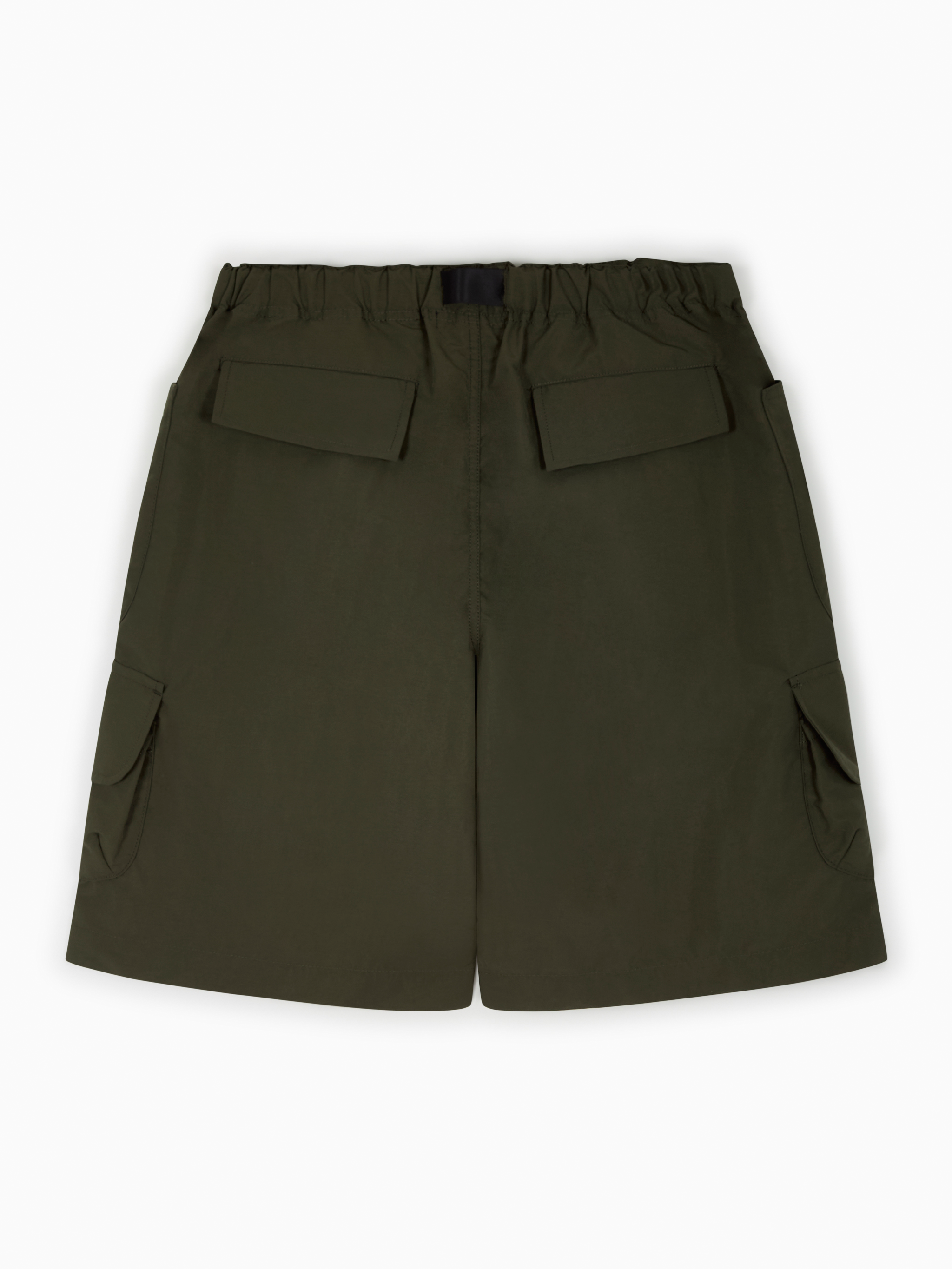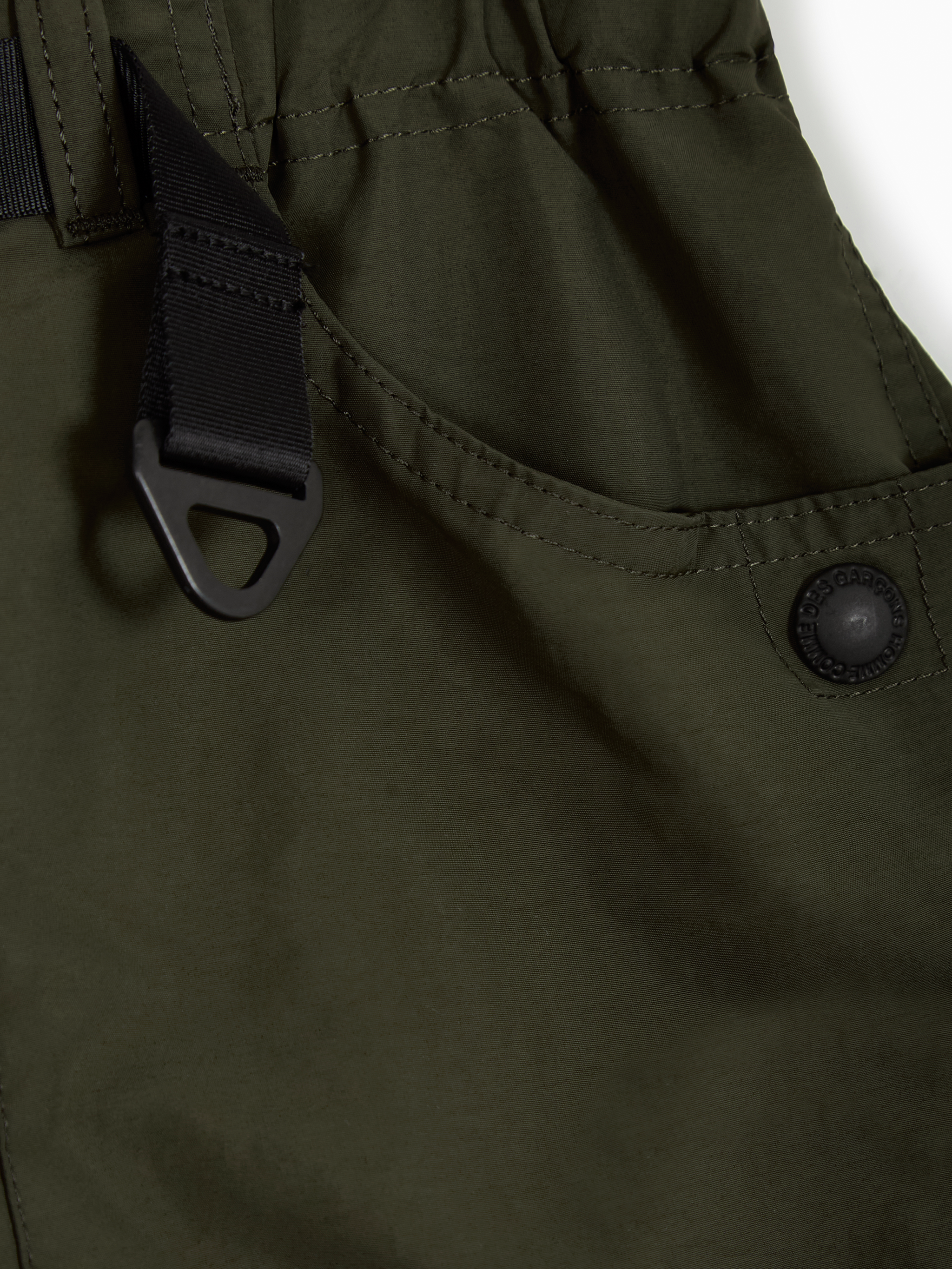 Bermudas cargo de Comme des Garçons Homme. Confeccionados en nylon verde caqui oscuro, con cinturón elástico integrado y bolsillos laterales de parche. Presentan bolsillos de solapa en la cintura y en la parte trasera, cierre de botón y cremallera, y pernera ancha.
