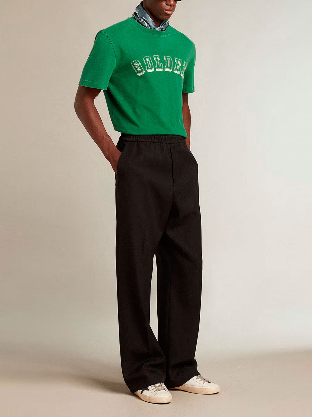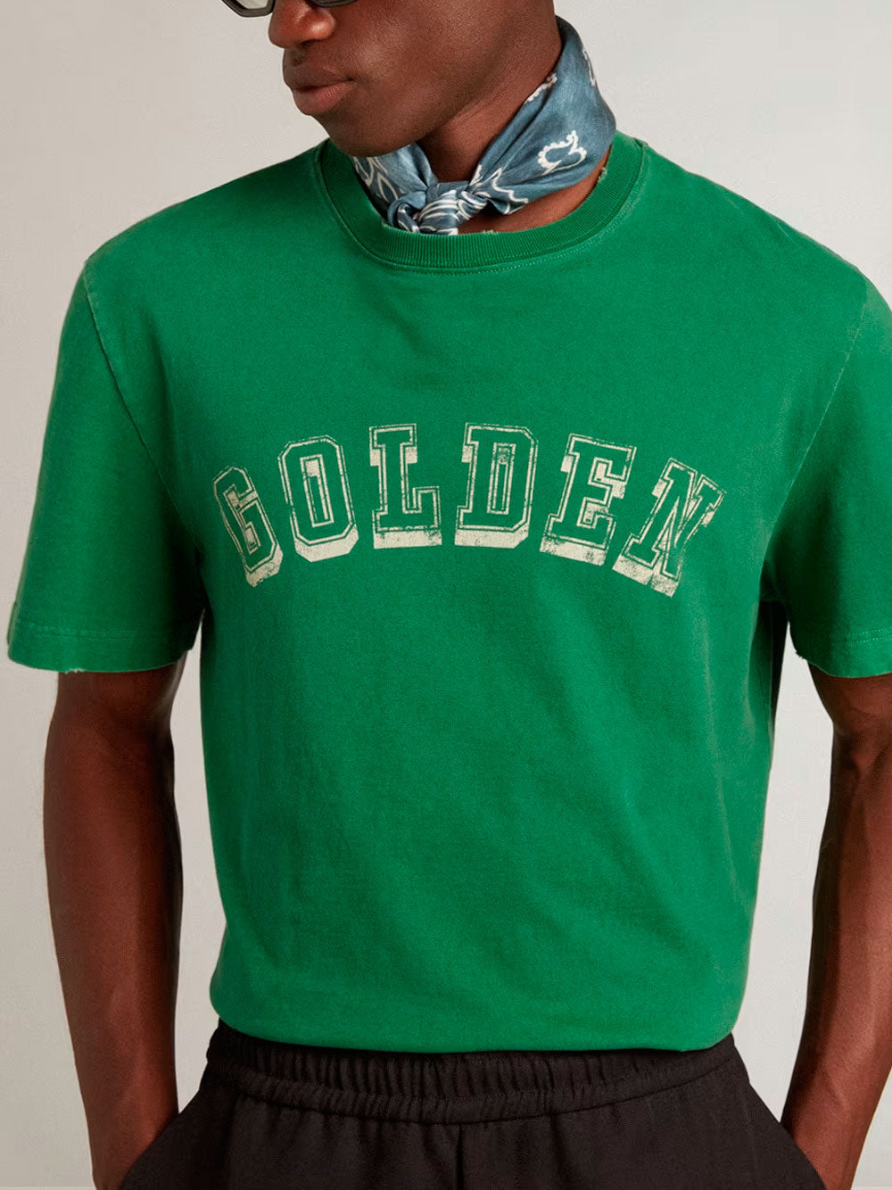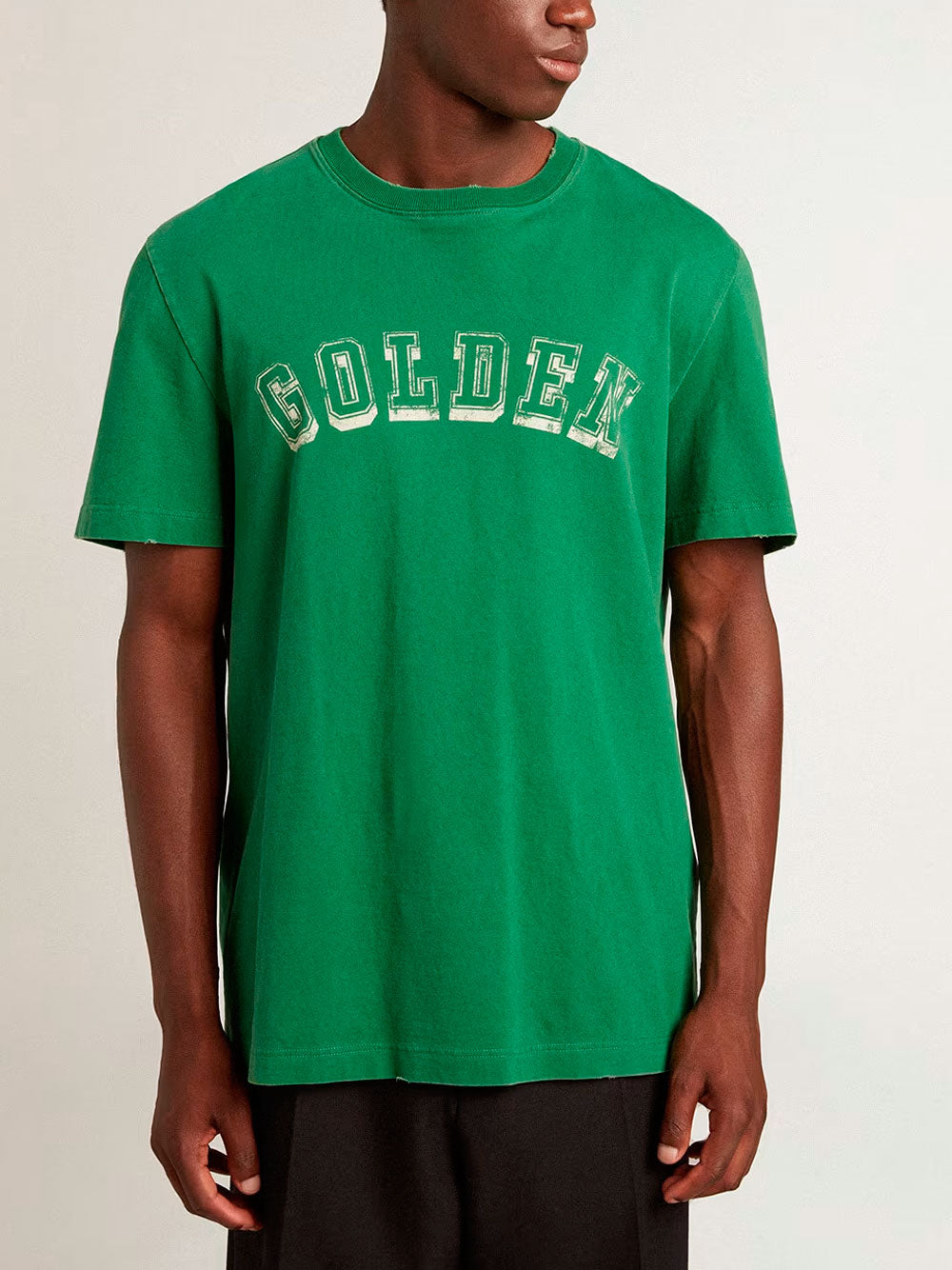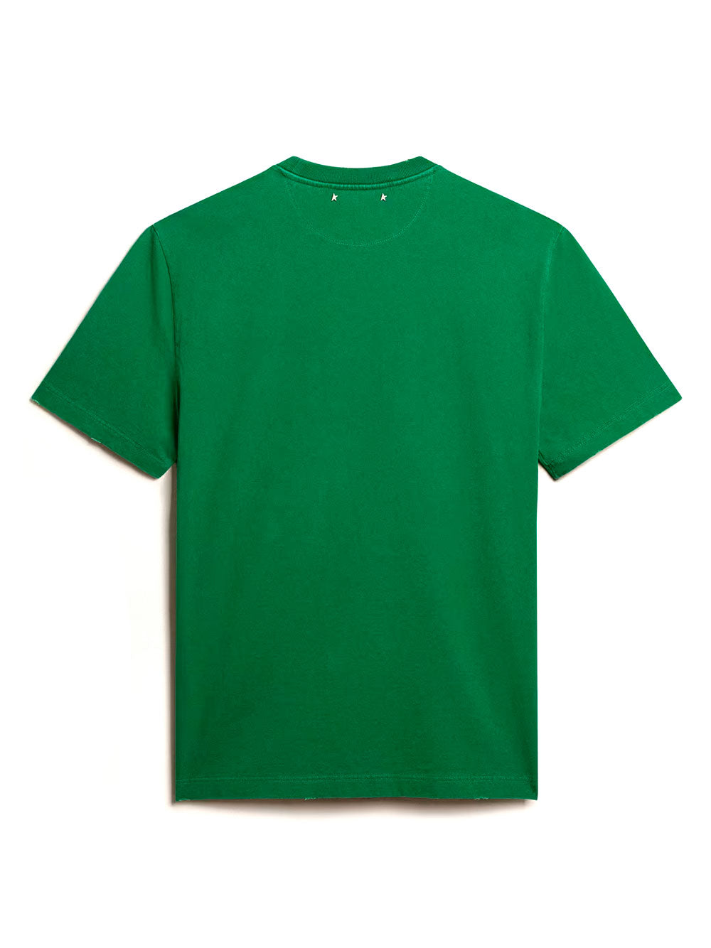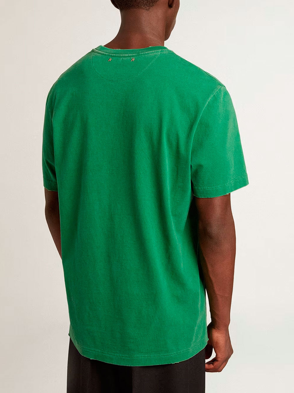 Camiseta de Golden Goose en algodón color verde con mensaje blanco en el centro. De la colección Journey, con doble estrella en la espalda, corte regular, efecto desgastado. Material del tejido acanalado, lavado a la piedra y con cuello redondo.