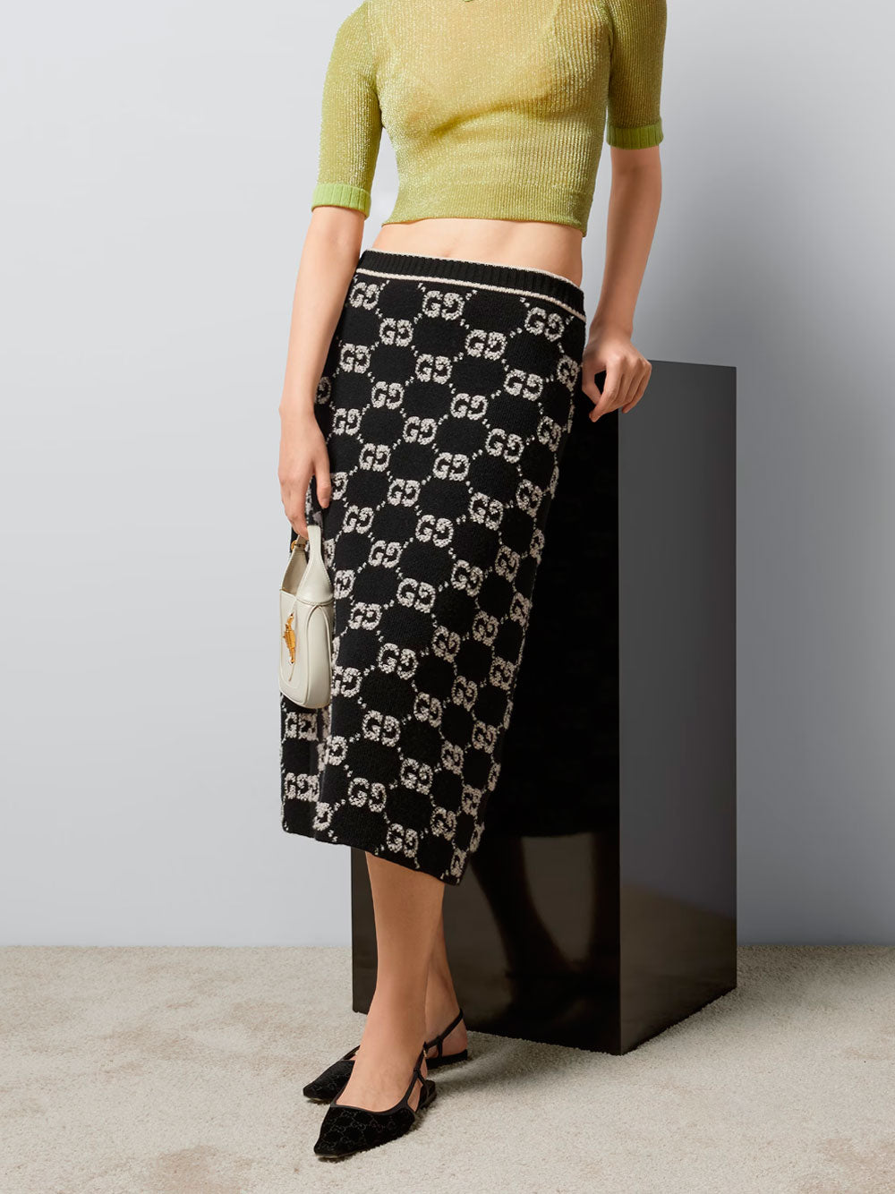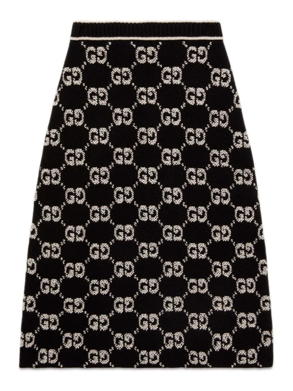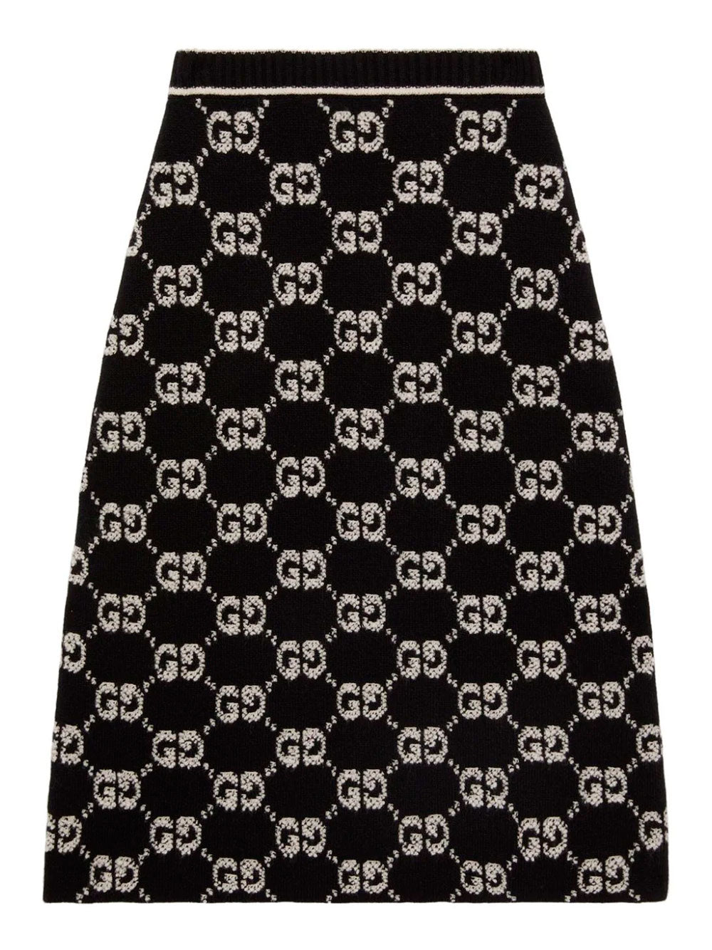 Falda de jacquard bouclé de lana GG de color negro de Gucci con construcción de punto. Presenta cintura de canalé, línea A, largo por debajo de la rodilla y bajo recto.