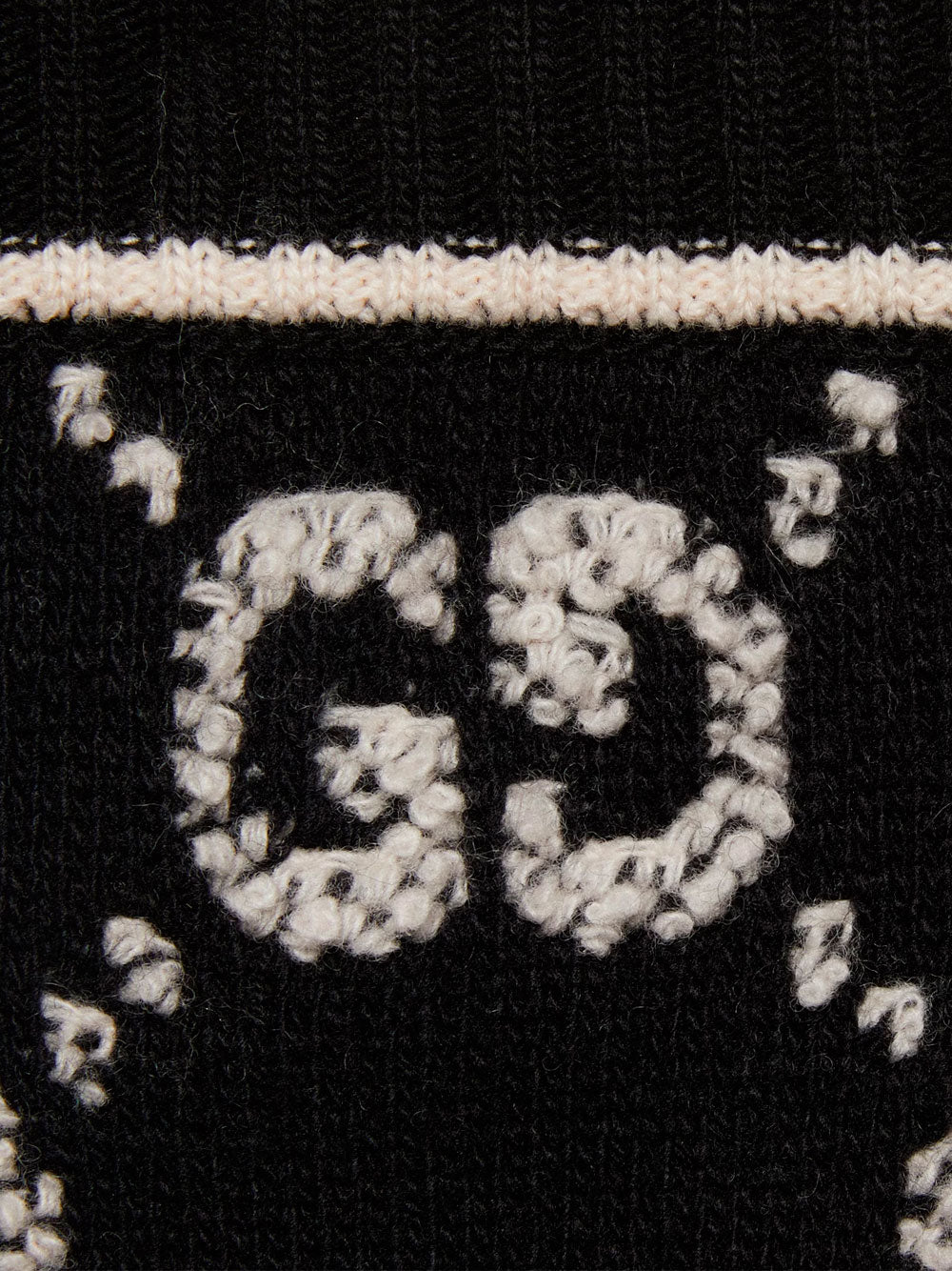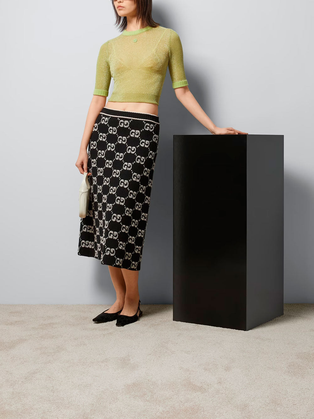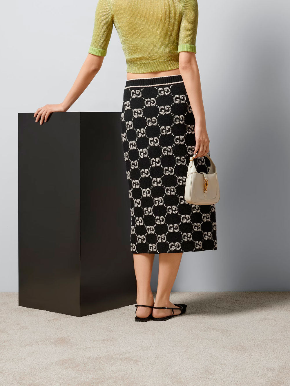 Falda de jacquard bouclé de lana GG de color negro de Gucci con construcción de punto. Presenta cintura de canalé, línea A, largo por debajo de la rodilla y bajo recto.