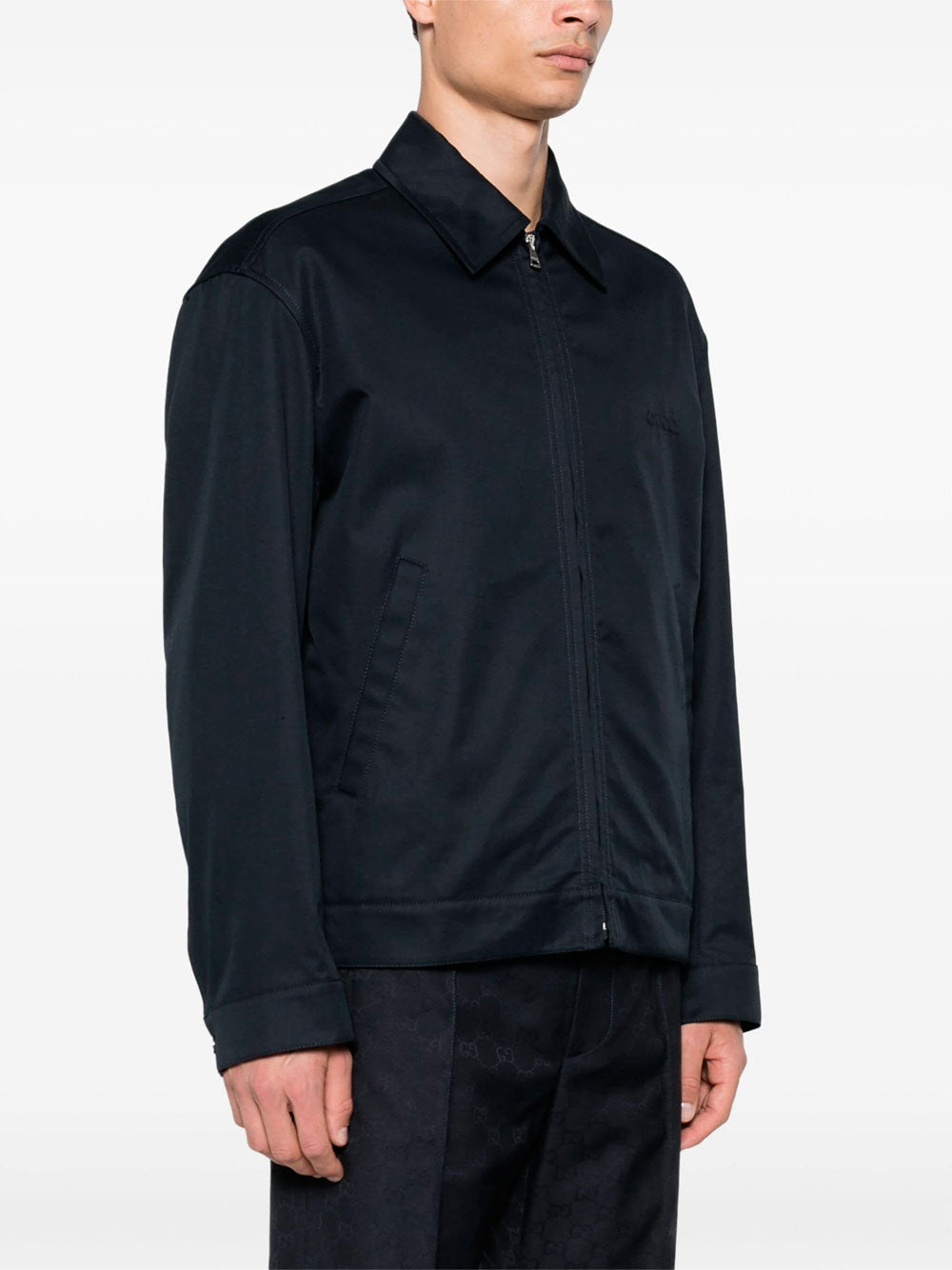 Cazadora de Gucci en azul marino. Confeccionada en algodón con acabado texturizado, cuello clásico, manga larga y puños con cierre de botones de presión. Con logo en relieve en la parte delantera, dos bolsillos laterales ribeteados y detalle característico de Sylvie Web. Se completa con dobladillo recto y cierre de cremallera frontal.
