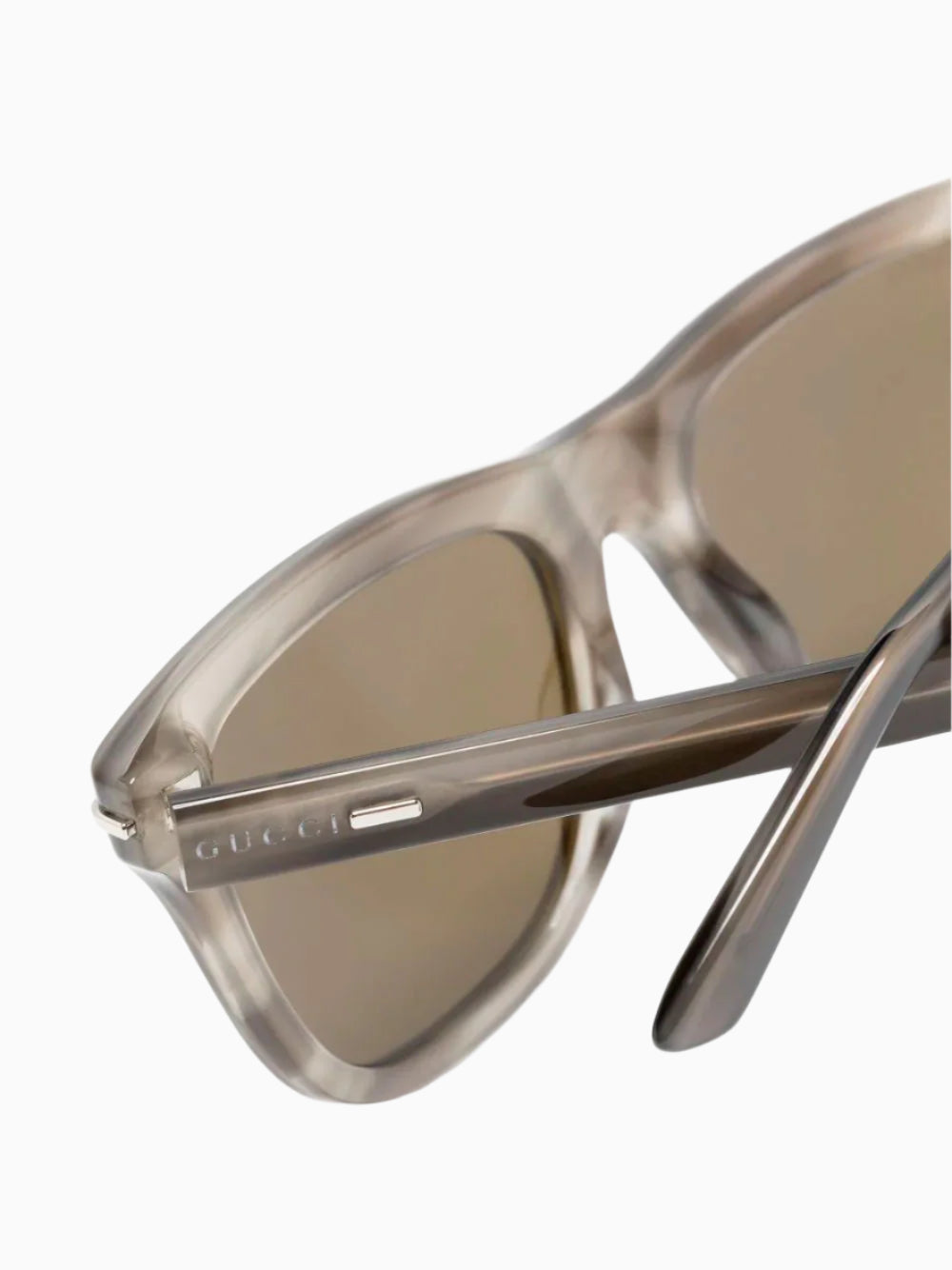 Gafas de sol de Gucci en gris topo con lentes tintadas con protección UV. Las gafas presentan una montura cuadrada de carey con efecto desteñido y detalles en tono plateado. Las finas patillas rectas presentan puntas curvadas y el logotipo de la marca grabado. Las lentes presentan el nombre de la marca grabado.