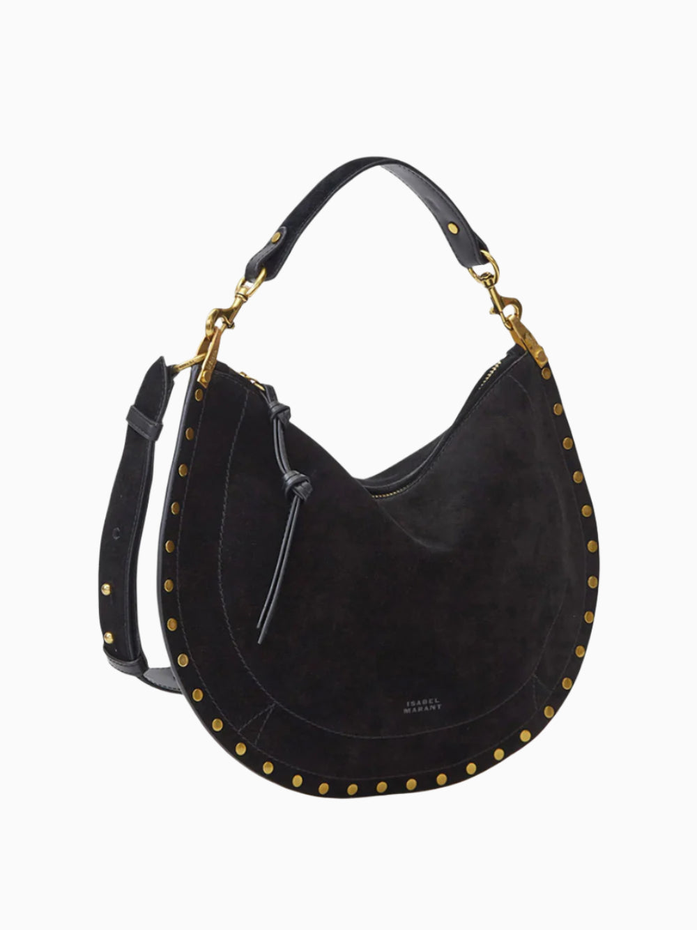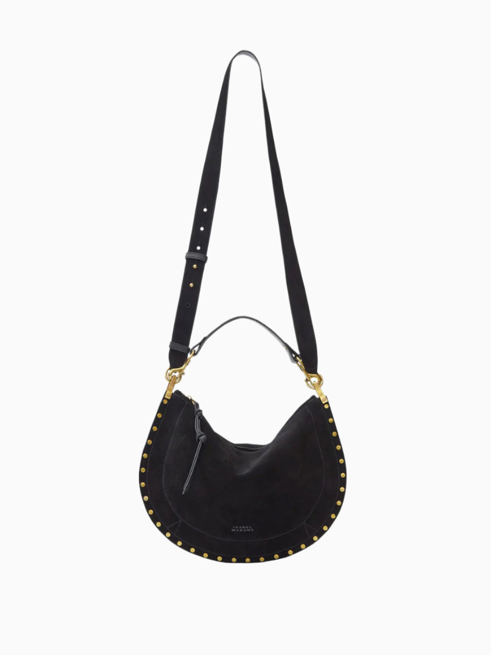Bolso Oskan Soft de Isabel Marant. Confeccionado en ante negro con cierre de cremallera superior, asa superior extraíble y correa de hombro ajustable y extraíble. Presenta un logo estampado en la parte delantera, detalle de tachuelas, un compartimento principal, un bolsillo interior de parche y logo estampado en el interior.