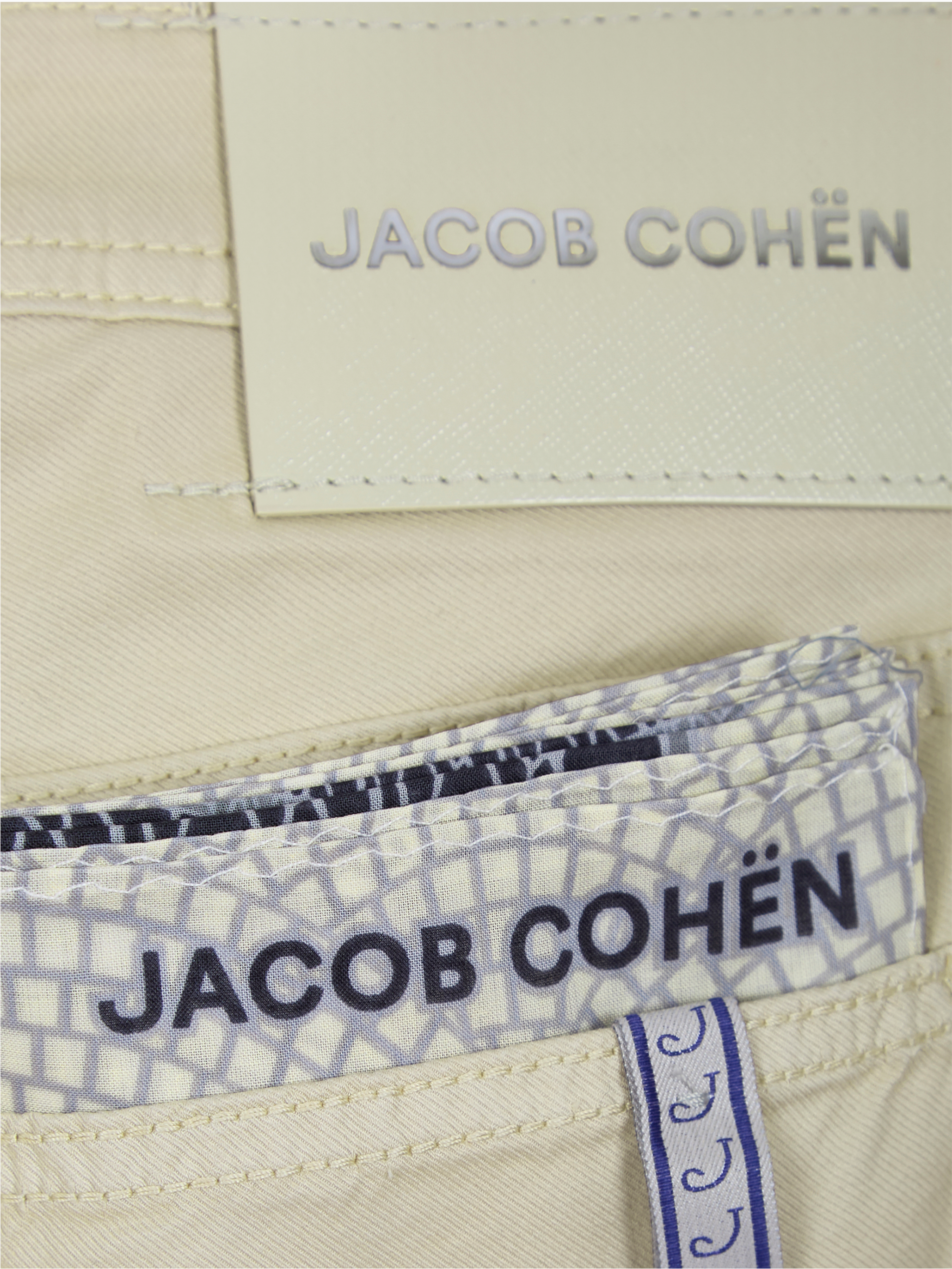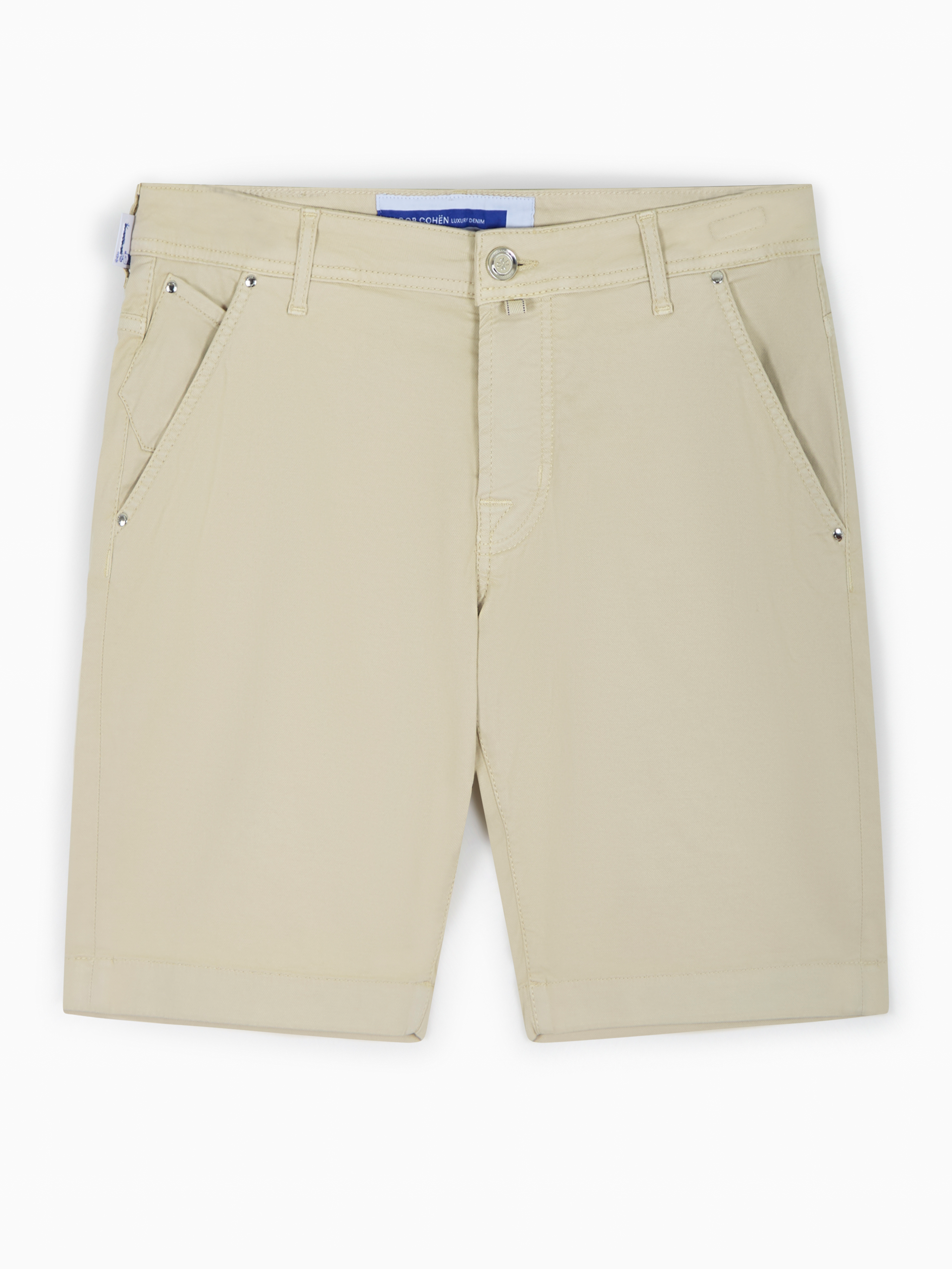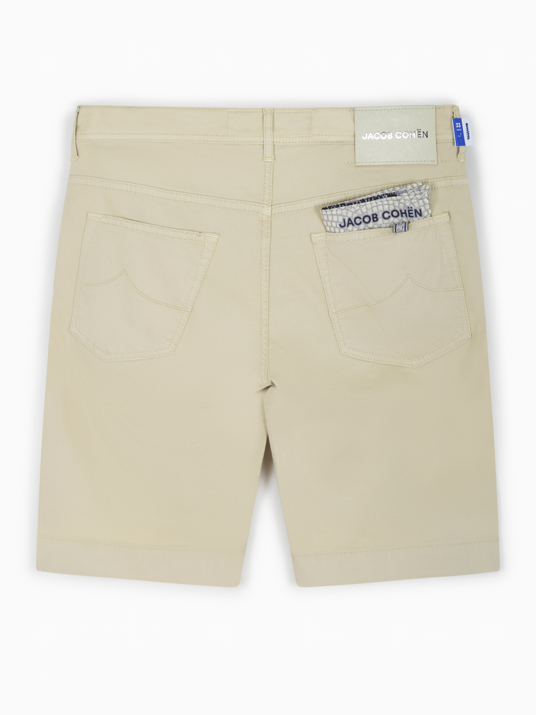 Bermudas Lou de Jacob Cohen. Confeccionadas en algodón color arena claro, con cinco bolsillos clásicos, cierre de botones, trabillas para el cinturón y parche con el logo en la parte trasera.