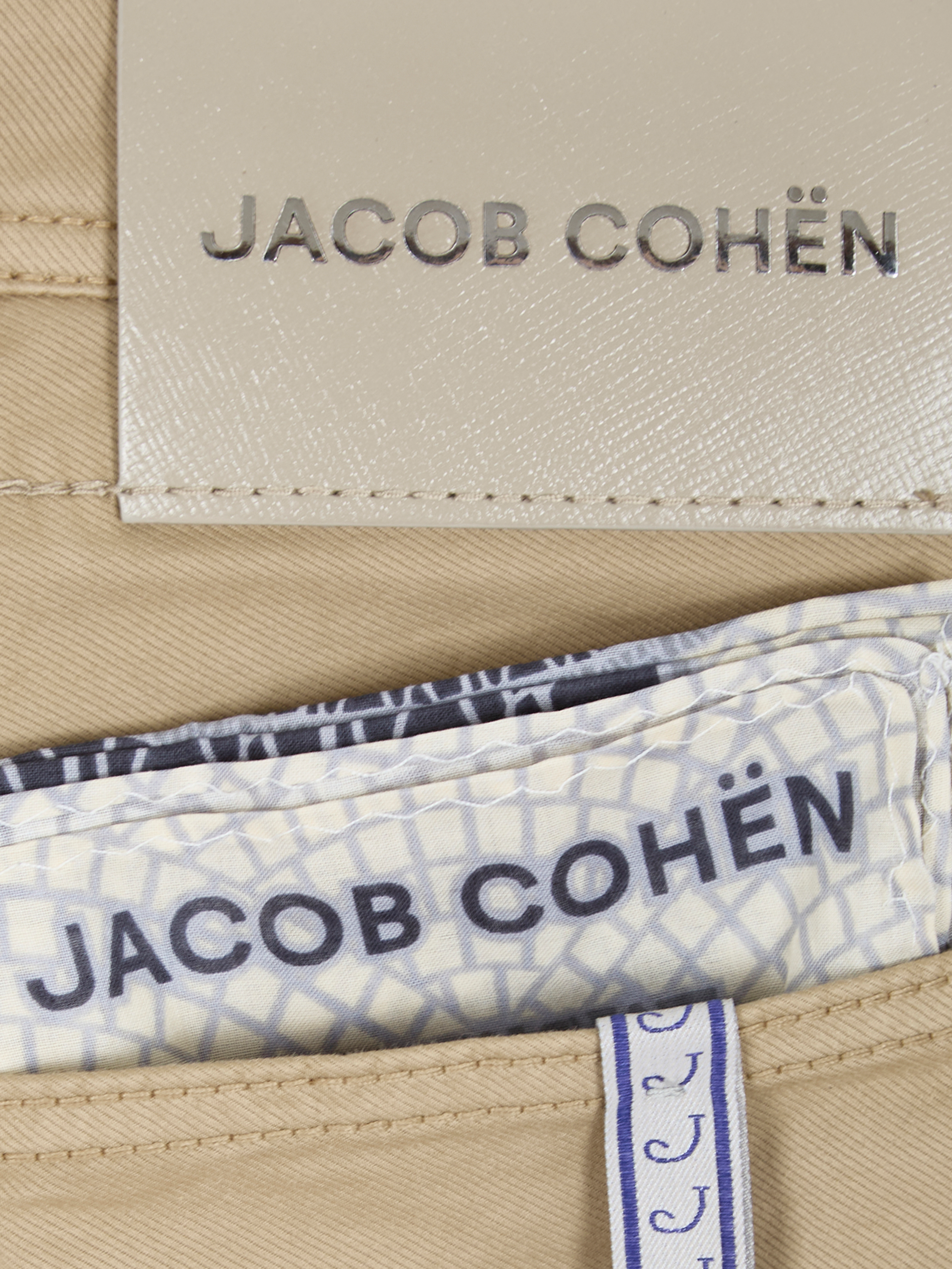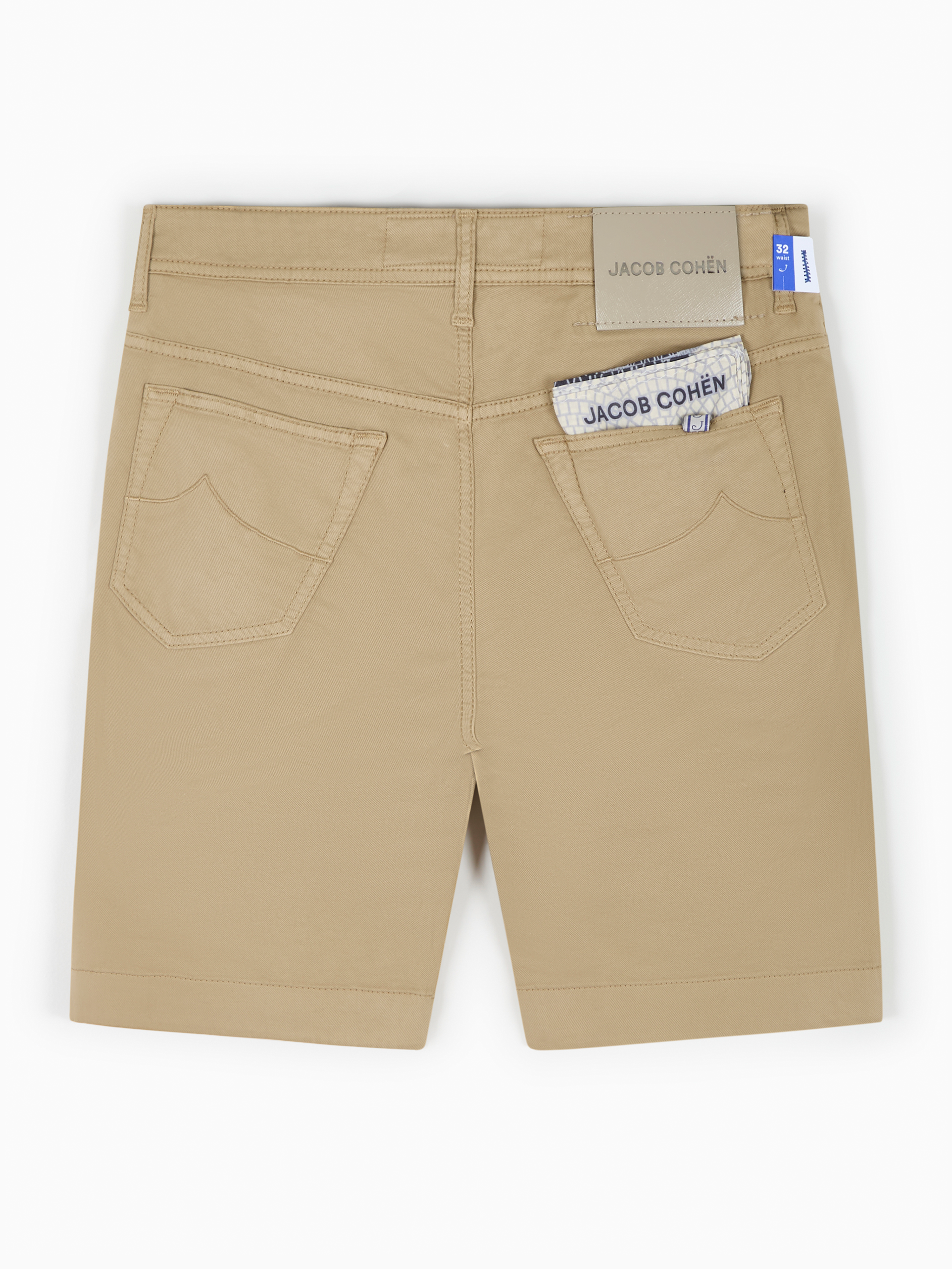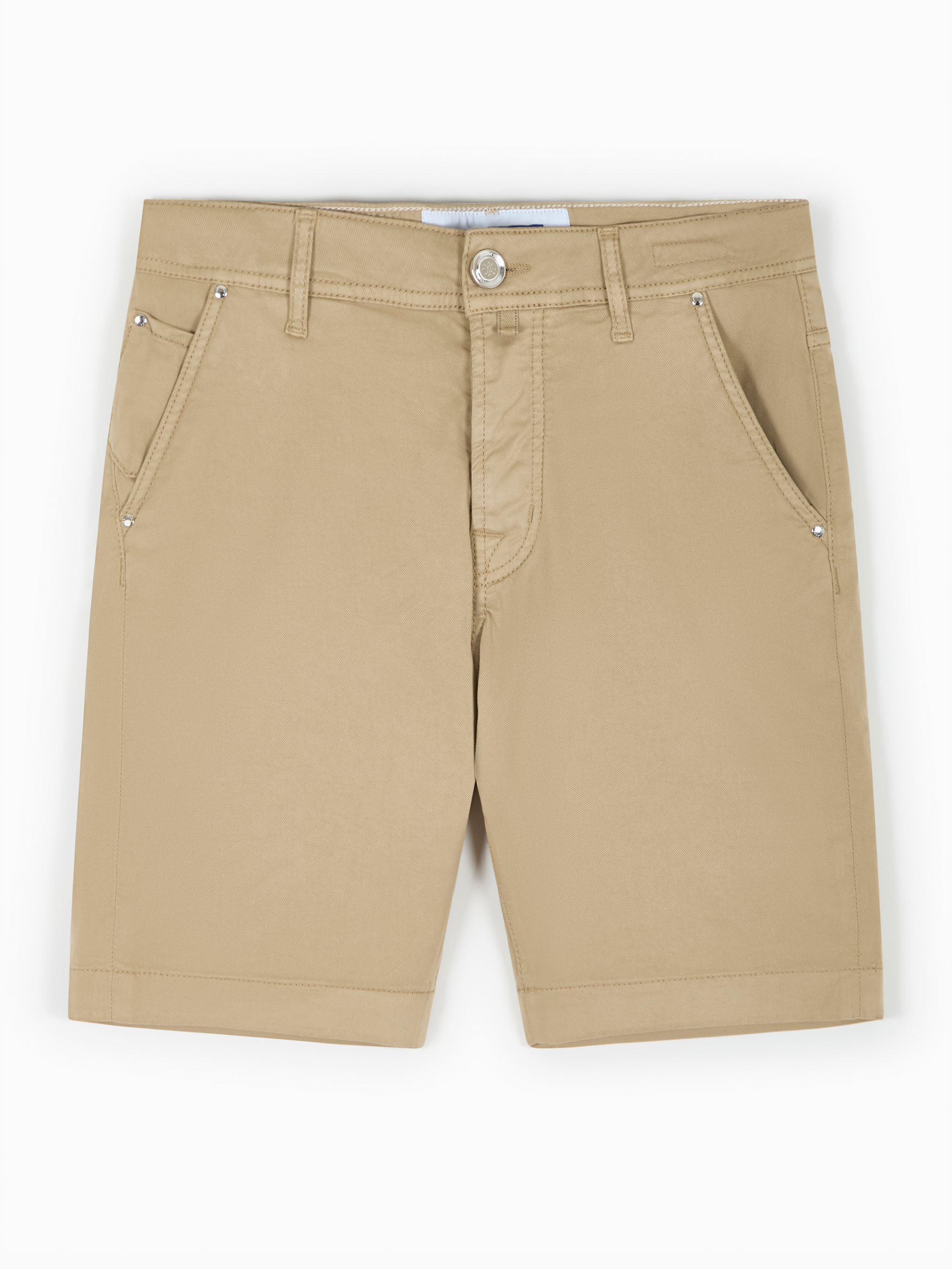 Bermudas Lou de Jacob Cohen. Confeccionadas en mezcla de algodón color arena oscuro, con cierre de botones, trabillas para el cinturón, cinco bolsillos clásicos y un parche con el logo en la parte trasera.