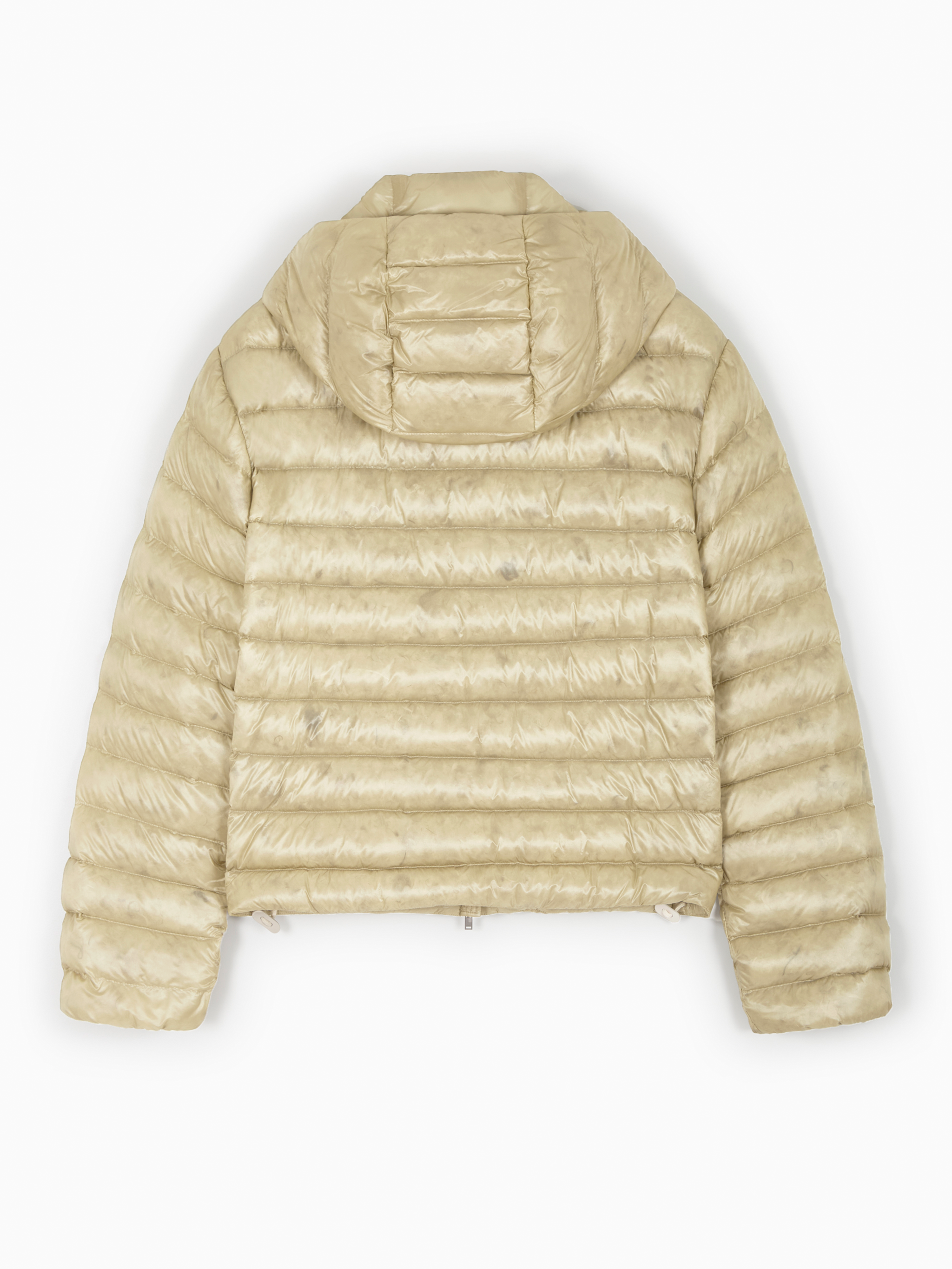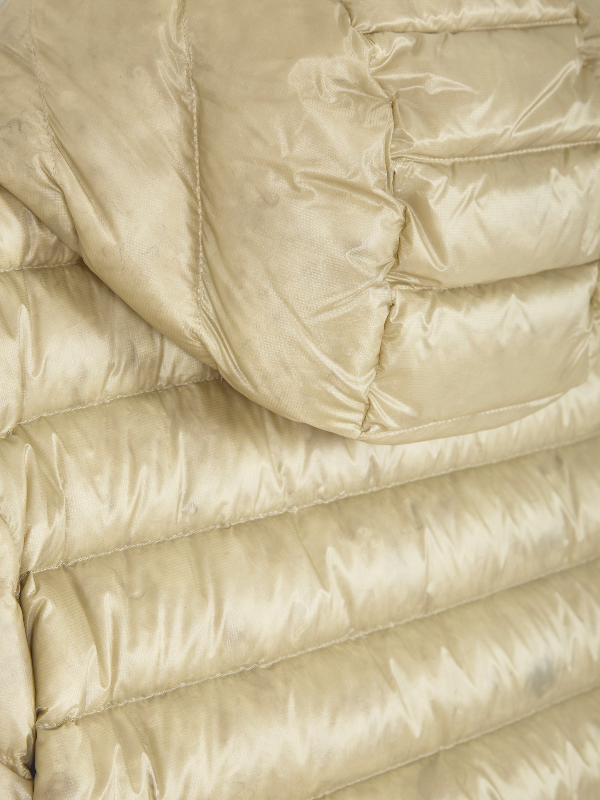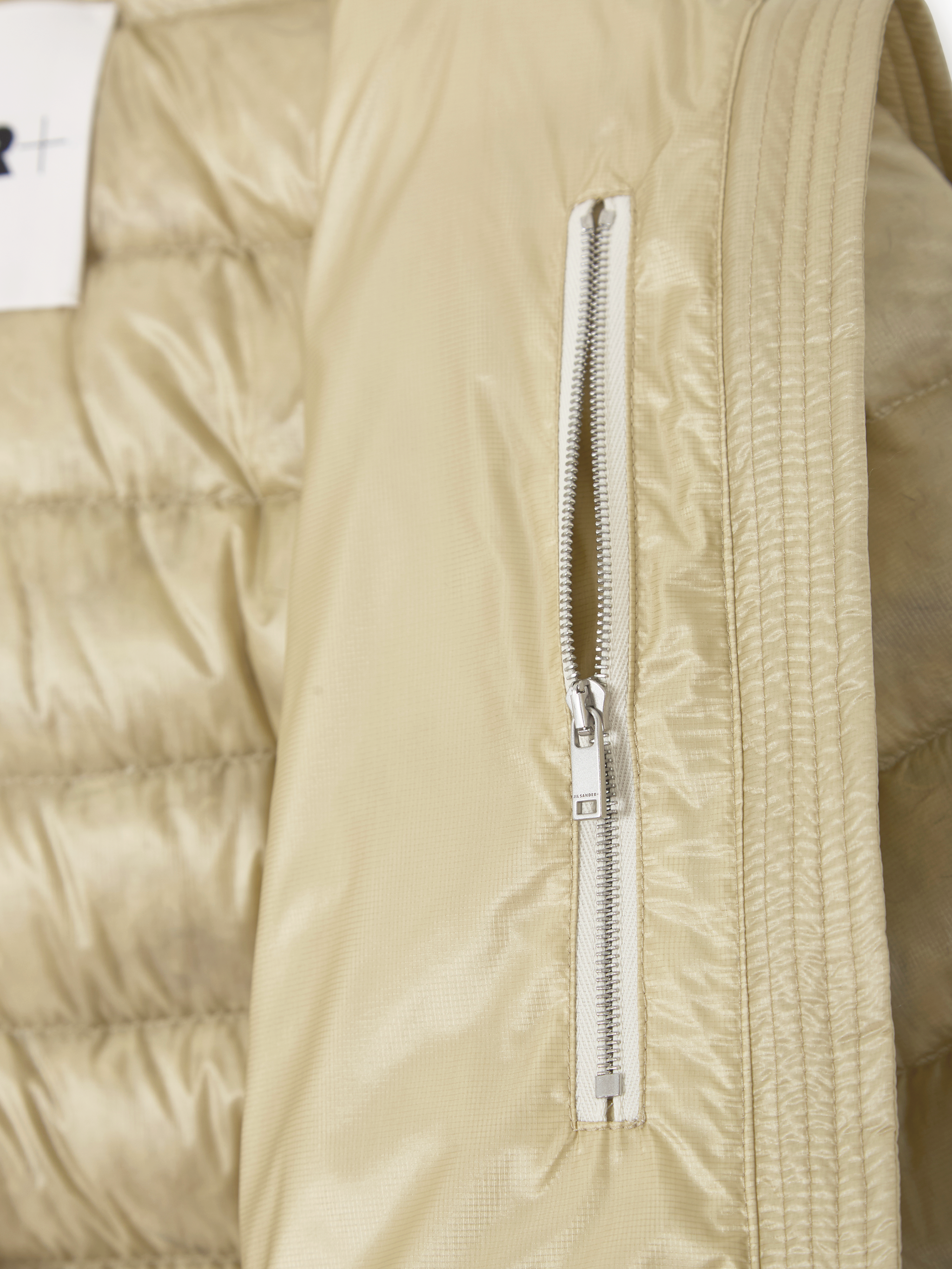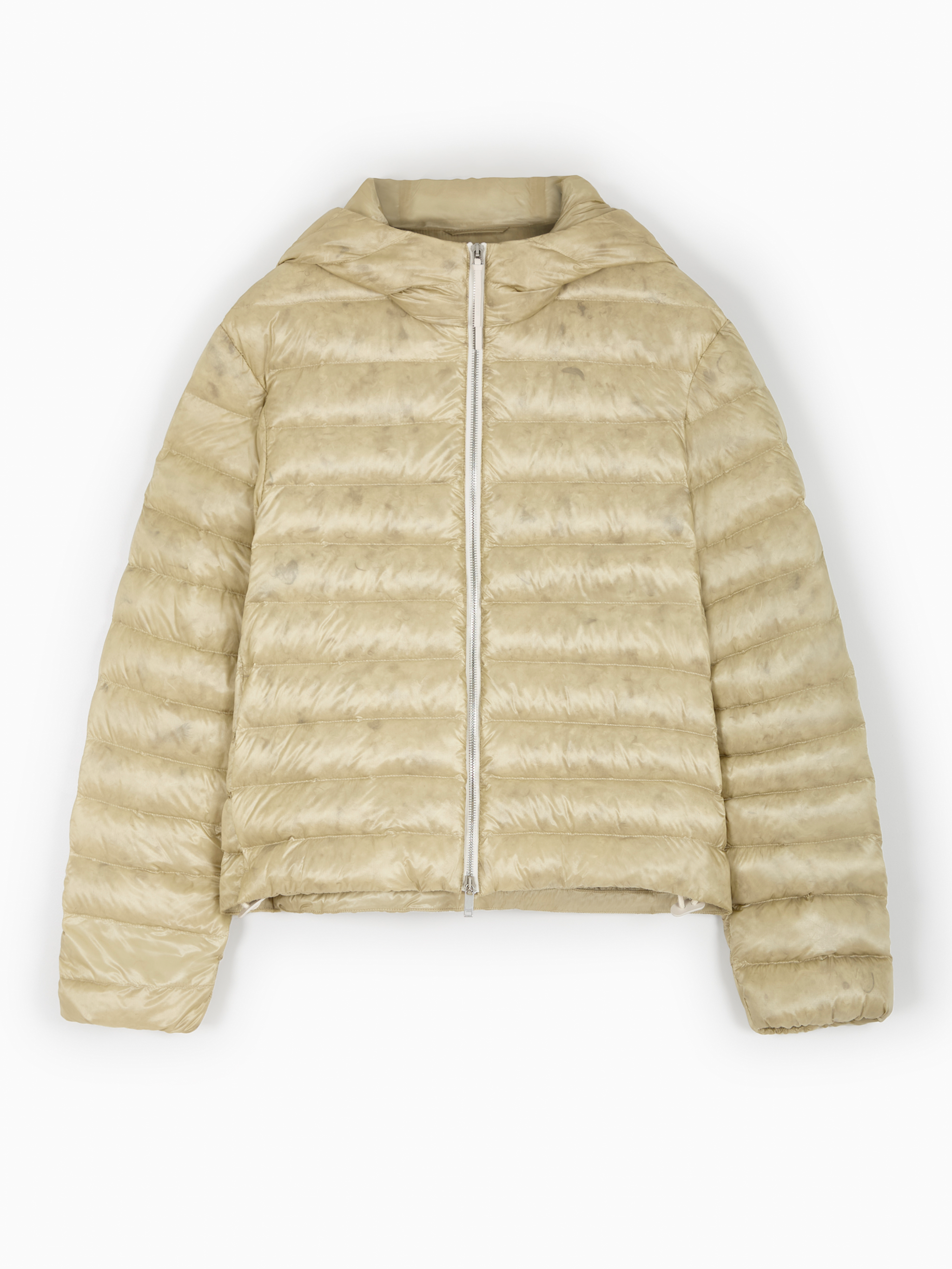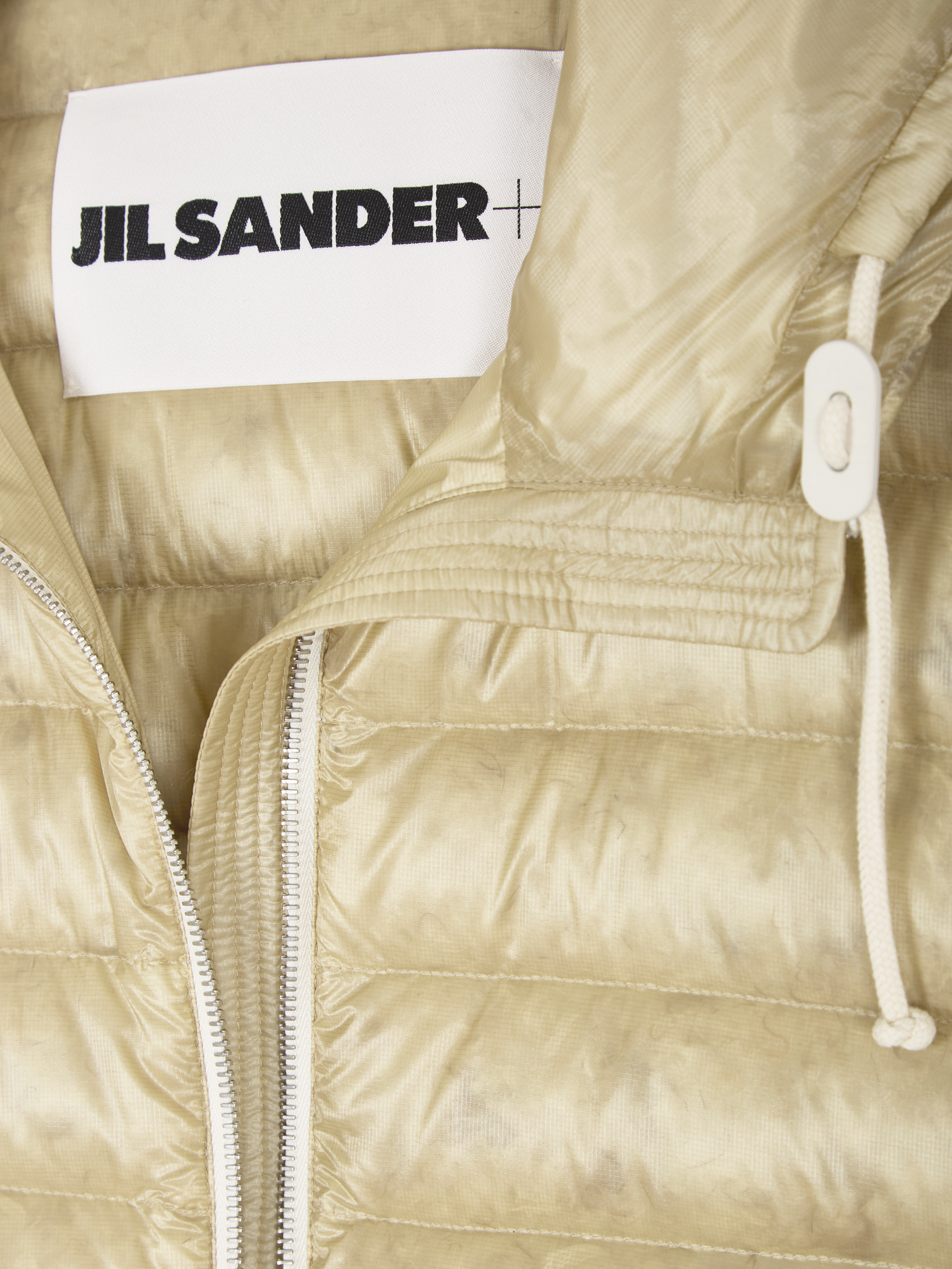 Plumífero ligero de Jil Sander. Confeccionado en nylon color mantequilla, con cierre de cremallera frontal, dos bolsillos laterales con cremallera y capucha con cordón. Presenta mangas largas, puños elásticos, bolsillo interior con cremallera y cordón interior en el bajo.