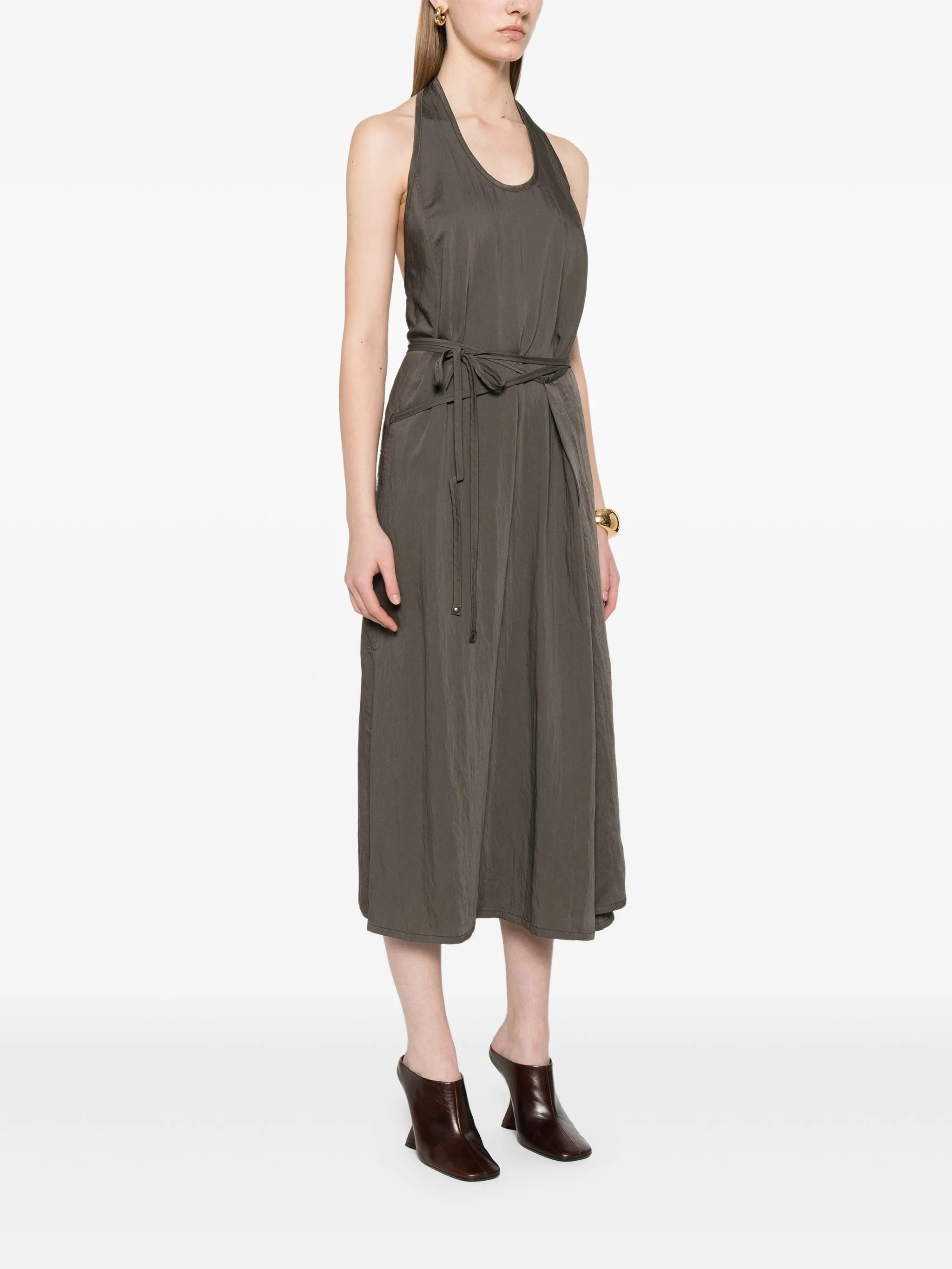 Vestido Apron de Lemaire. Confeccionado en mezcla de viscosa marrón oscuro, fluido, con un cinturón envolvente y espalda descubierta. Presenta escote en U y corte sin mangas.