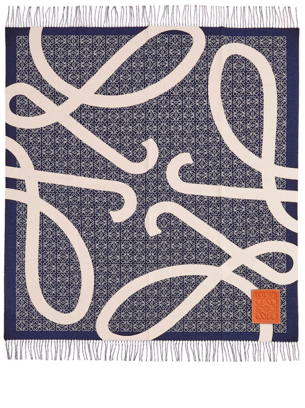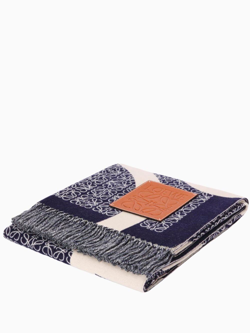 Manta de Loewe en jacquard de lana bicolor marino con patrón integral de Anagrama, motivo L a contraste y bordes con flecos. Con parche de piel de ternera con Anagrama en relieve.