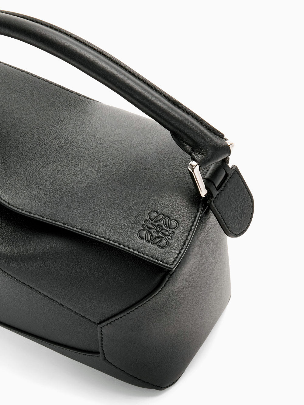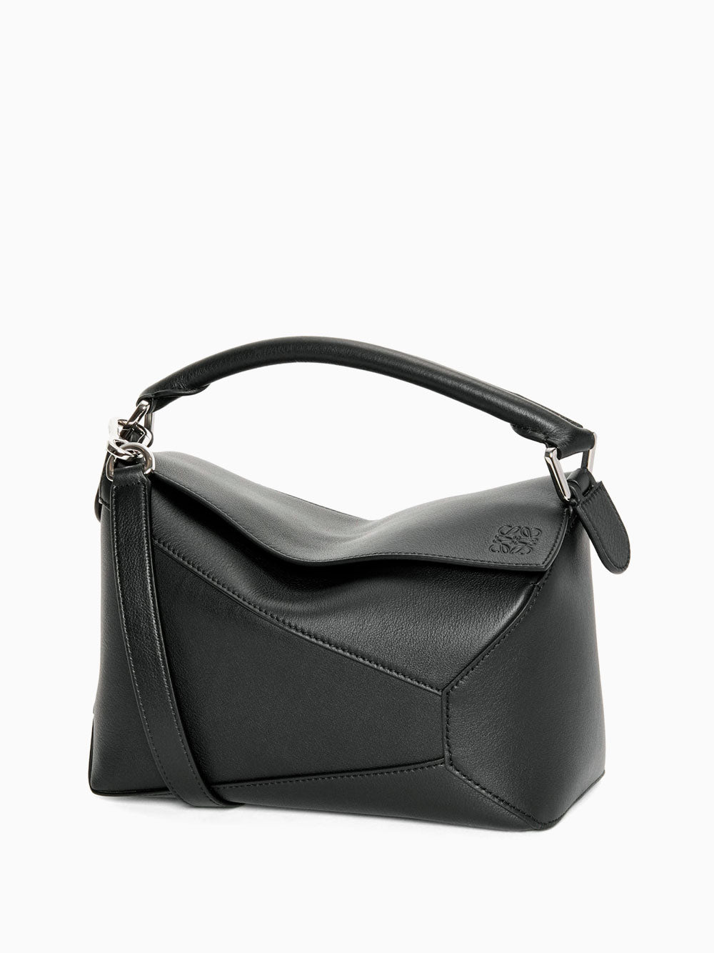 El bolso Puzzle es el debut para LOEWE del Director Creativo Jonathan Anderson. Una forma cuboide y una técnica de corte precisa crean las distintivas líneas geométricas de Puzzle. Esta versión pequeña está confeccionada en piel clásica, con asa bandolera, bandolera cruzada o de mano, correa desmontable y ajustable, asa superior, cierre de cremallera con tirador de piel de becerro, un bolsillo exterior con cremallera, un bolsillo interior con cremallera, forro de lona de algodón en espiga y Anagrama en relieve.