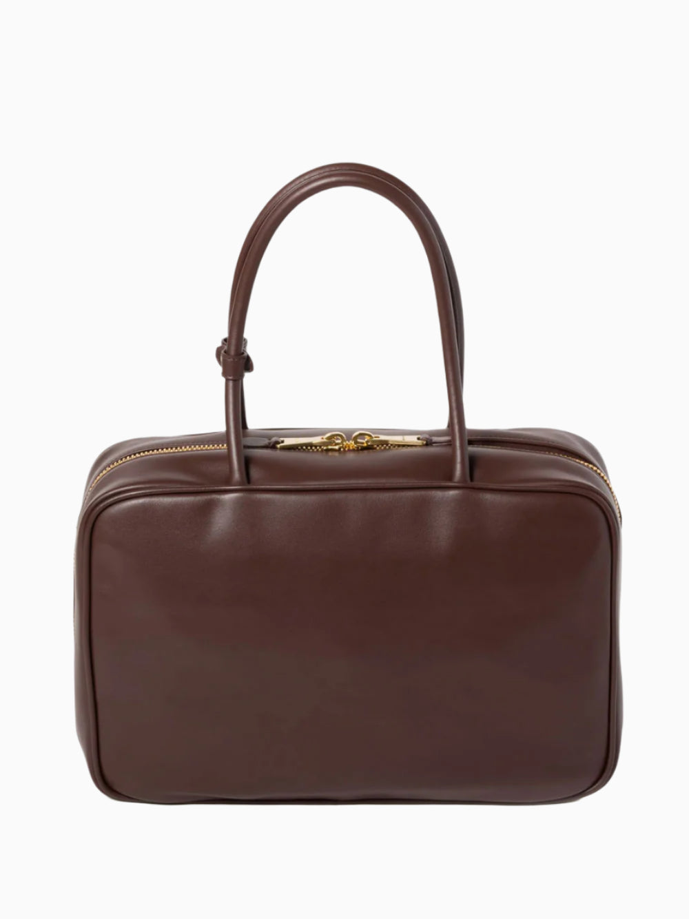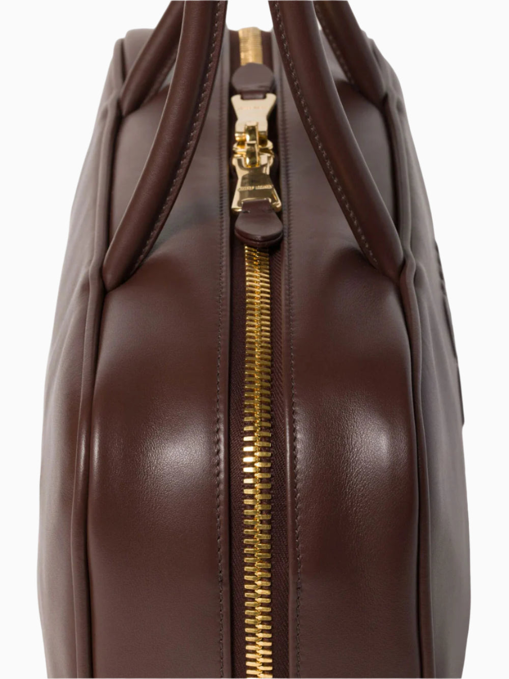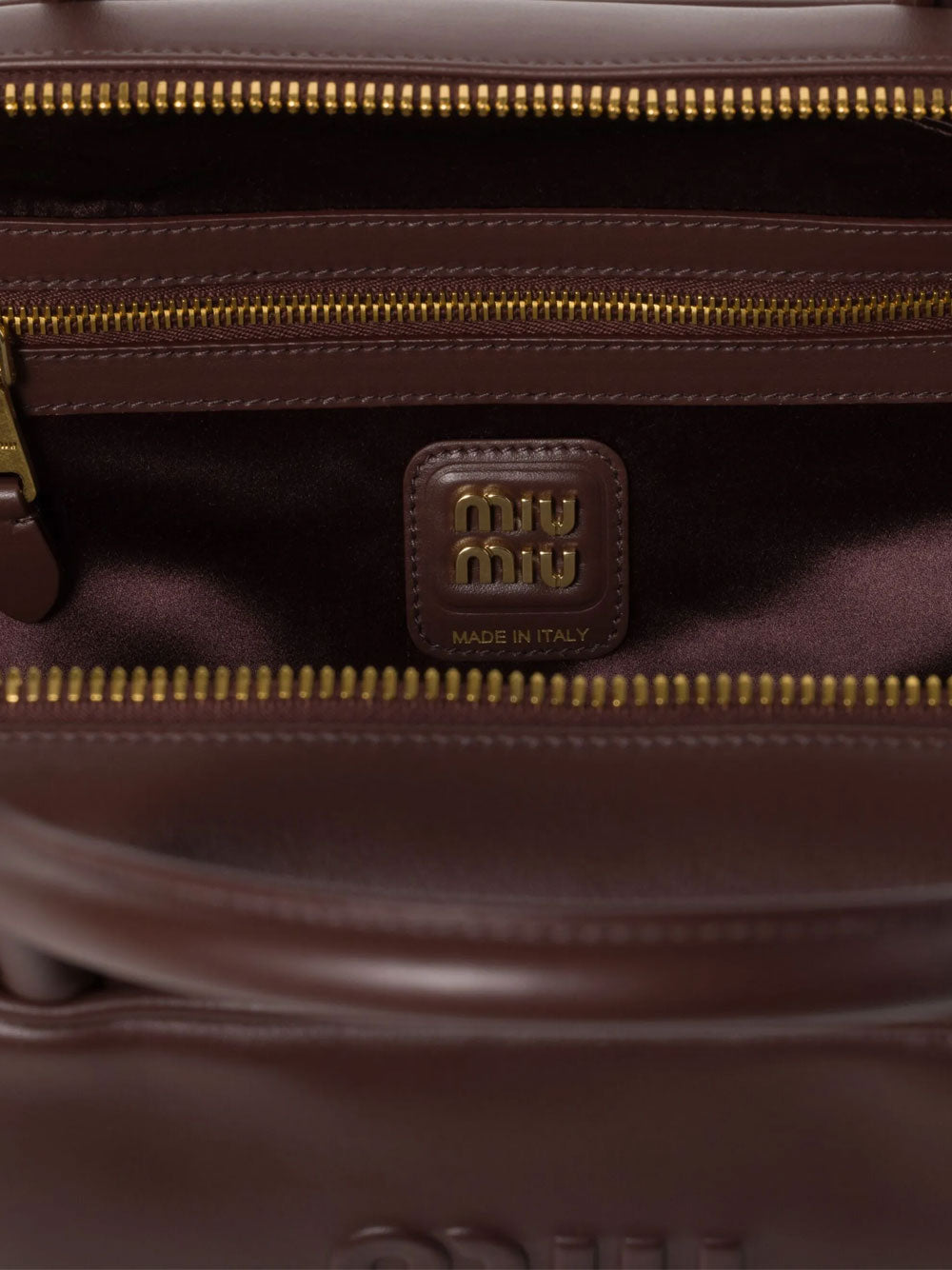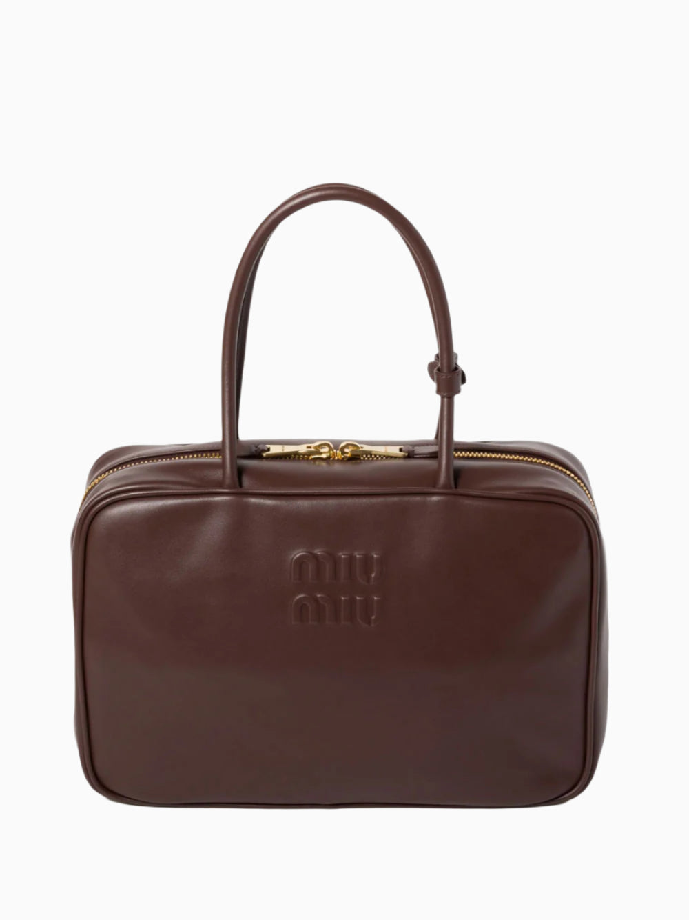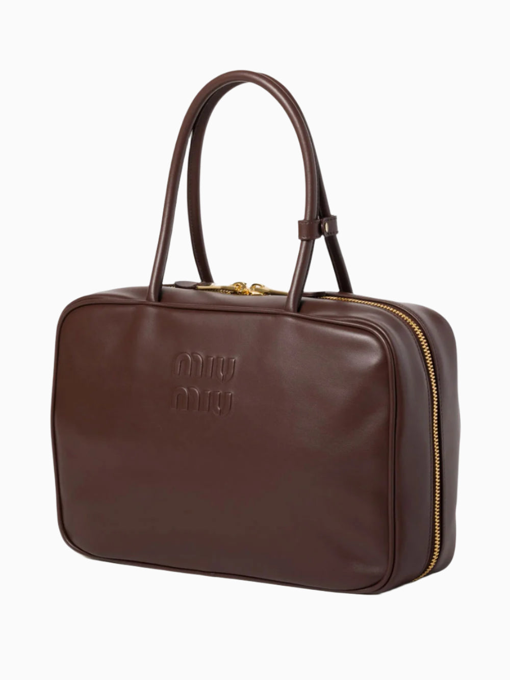 Bolso de Miu Miu en piel de grano liso en marrón café. Con herrajes dorados, logotipo en relieve en la parte delantera y parche interior con logotipo. Cierre de cremallera integral y bolsillo interior con cremallera. Dos asas superiores enrolladas. Compartimento principal. Forro completo.