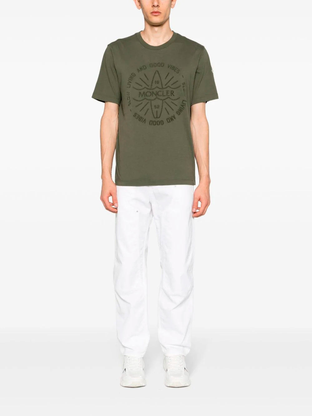 Camiseta de Moncler en algodón verde oliva. Confeccionada en punto ligero con un logo bordado con slogan en la parte delantera, motivo de surf y un parche con el logo en la manga. Con cuello redondo, manga corta, bajo recto y código QR de autenticidad.