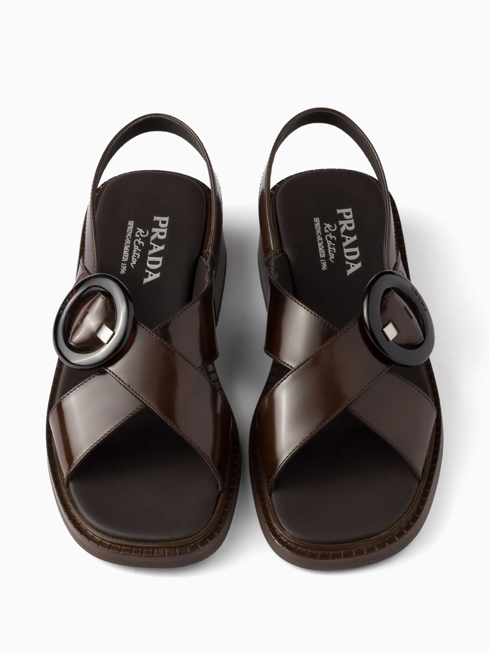 Sandalias con hebilla de Prada en color marrón café. Con tira slingback, tira cruzada en la puntera, puntera abierta redonda y tacón bajo.