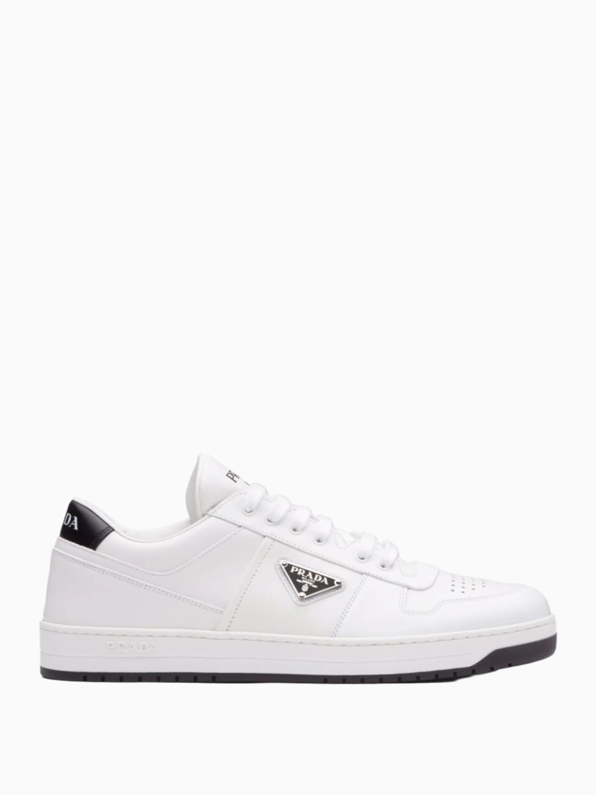 Sneakers Downtown de Prada. Confeccionados en piel blanca decorada con el logo en la ligera suela de goma y logo triangular de metal esmaltado en el lateral del empeine. Con ojales de metal, cordones de algodón y plantilla extraíble forrada en piel.