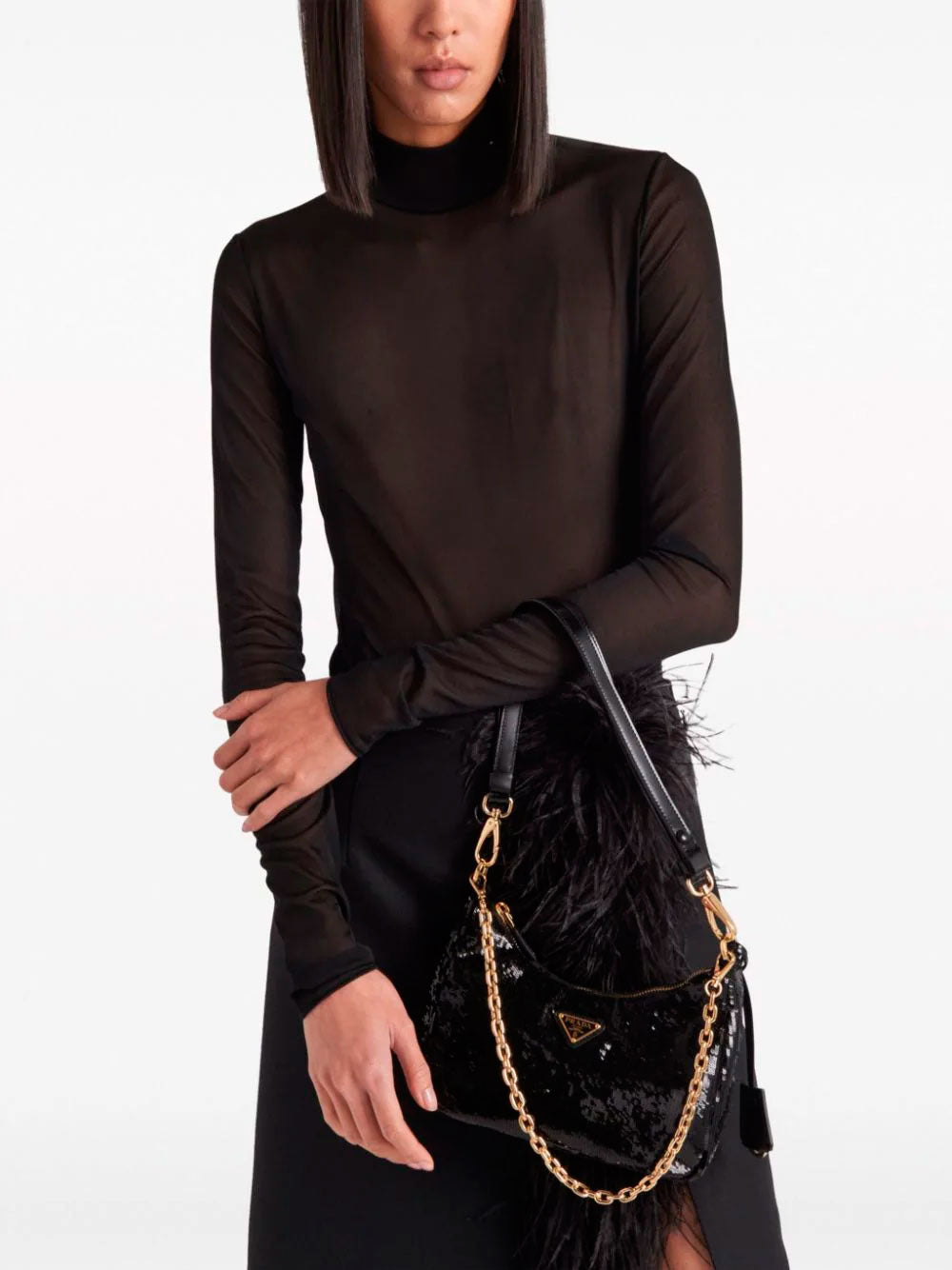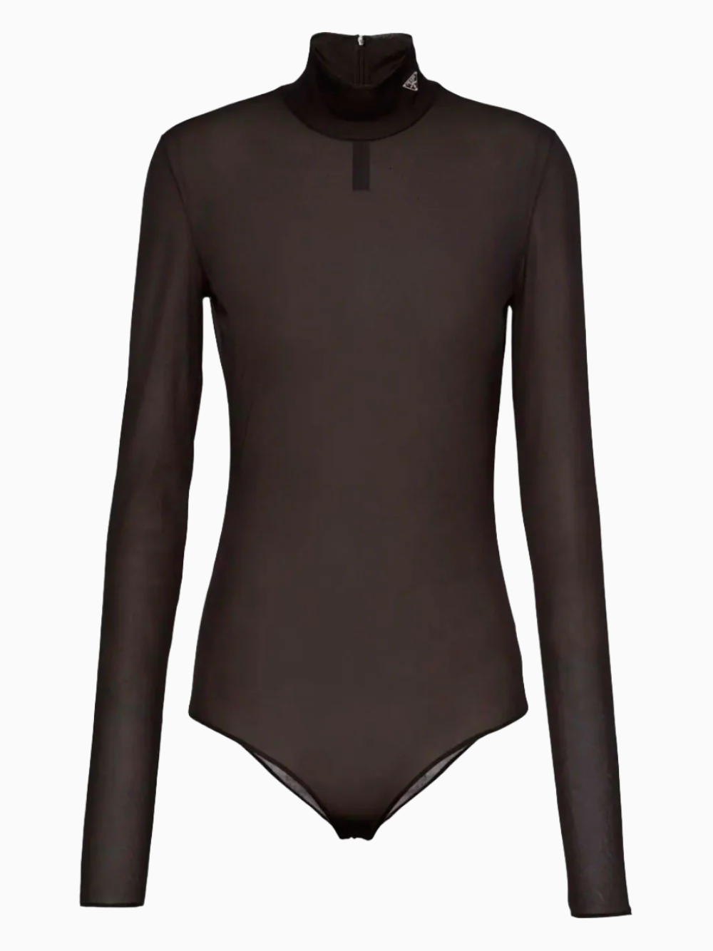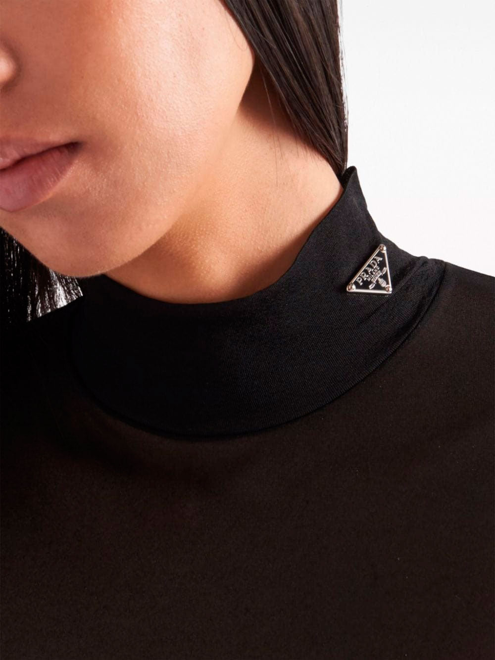Body de punto negro Gazar de Prada, con cuello alto decorado con la placa de logo triangular plateado. Manga larga, cierre delantero con cremallera y automáticos.
