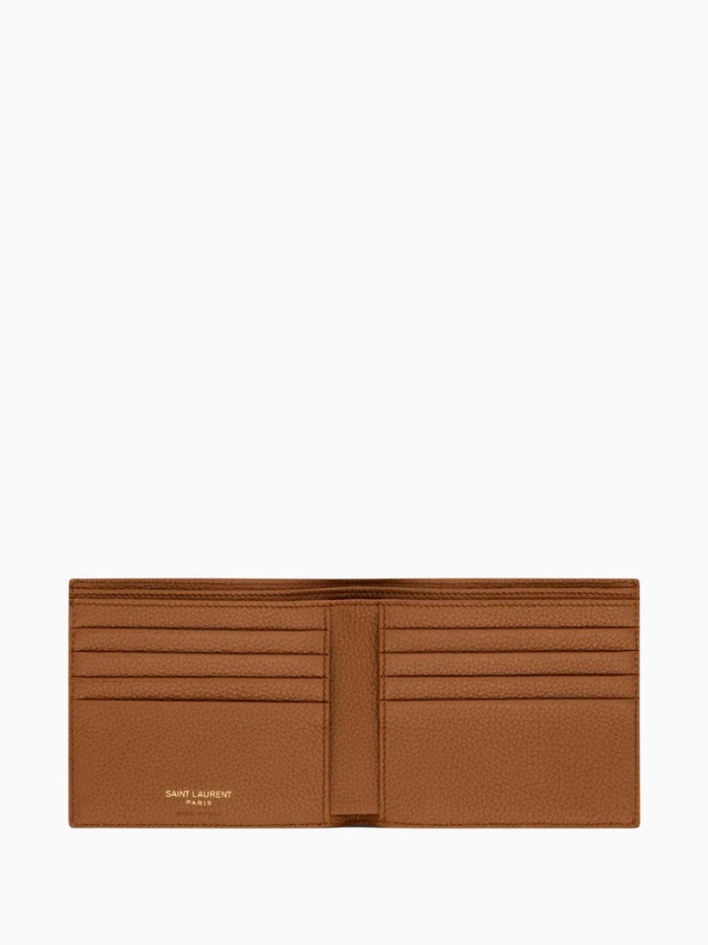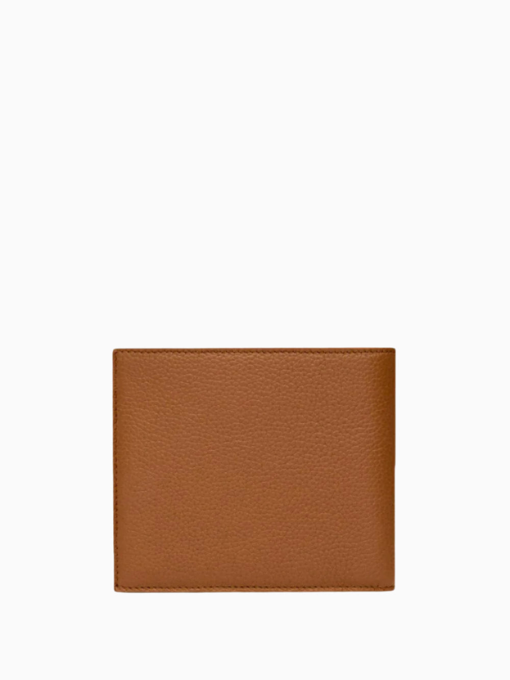 Billetero de Saint Laurent en cuero marrón. Confeccionado con textura granulada, logo grabado en relieve en la parte delantera y diseño plegable. Con ranuras para tarjetas y compartimento para billetes.