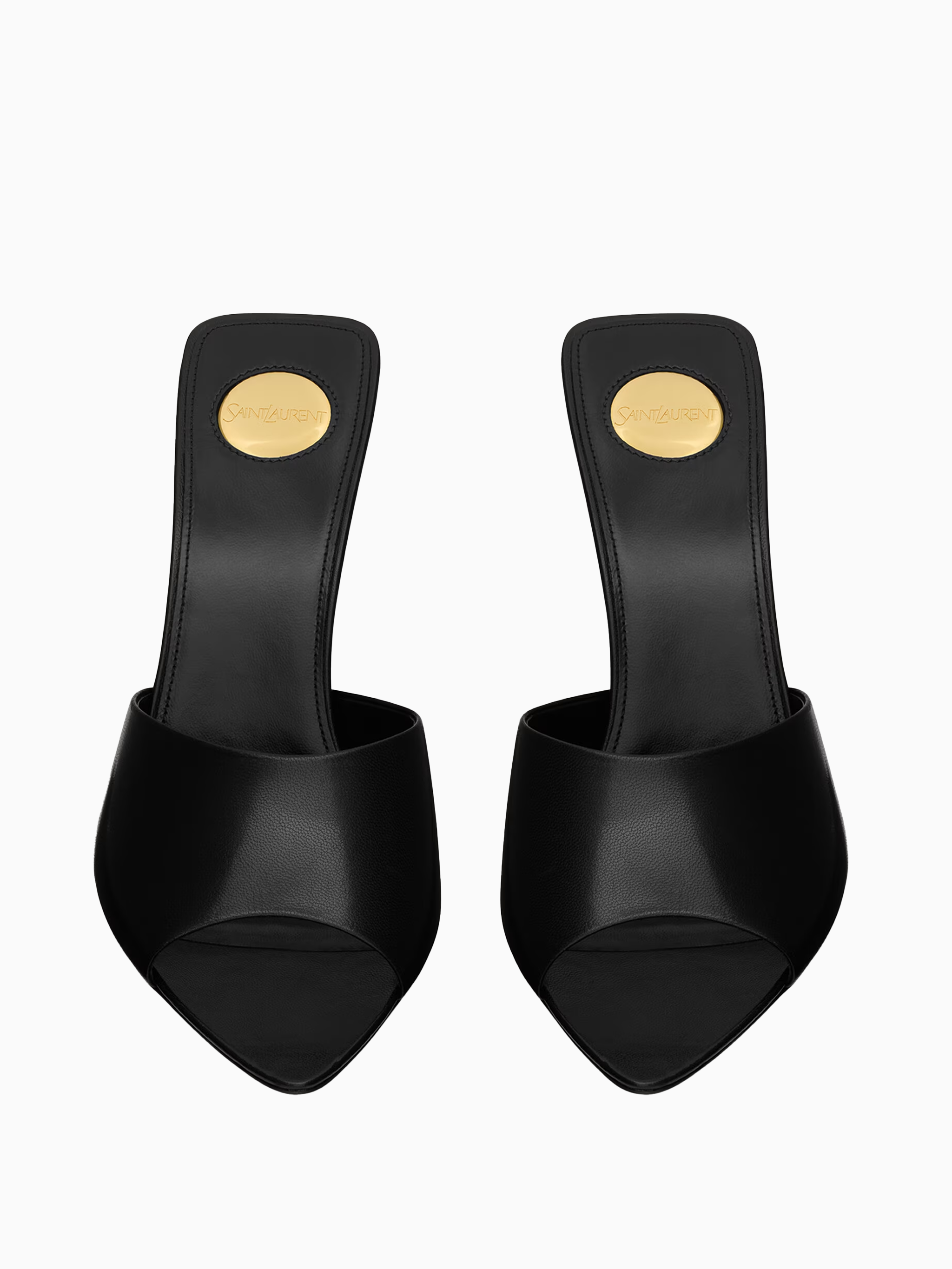 Mules de Saint Laurent de tacón de aguja con puntera en punta de almendra y banda gruesa en el arco. Suela de piel y placa redonda de metal con grabado Saint Laurent en la plantilla.