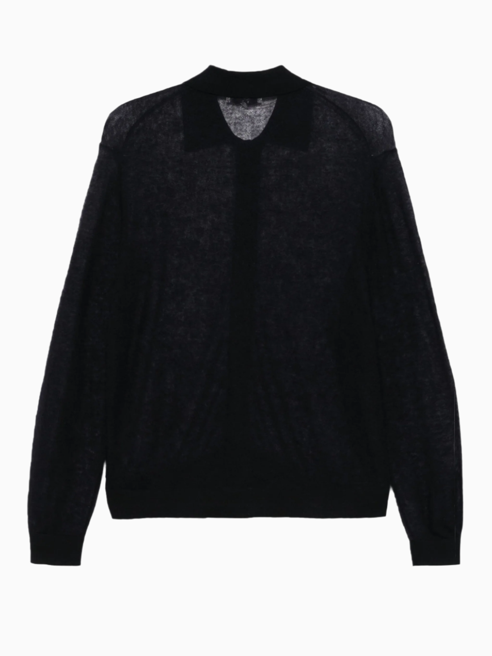 Polo semitransparente de Tibi. Confeccionado en mezcla de lana de alpaca azul marino con un tejido semitransparente y ligero, cuello tipo polo y diseño de botones.