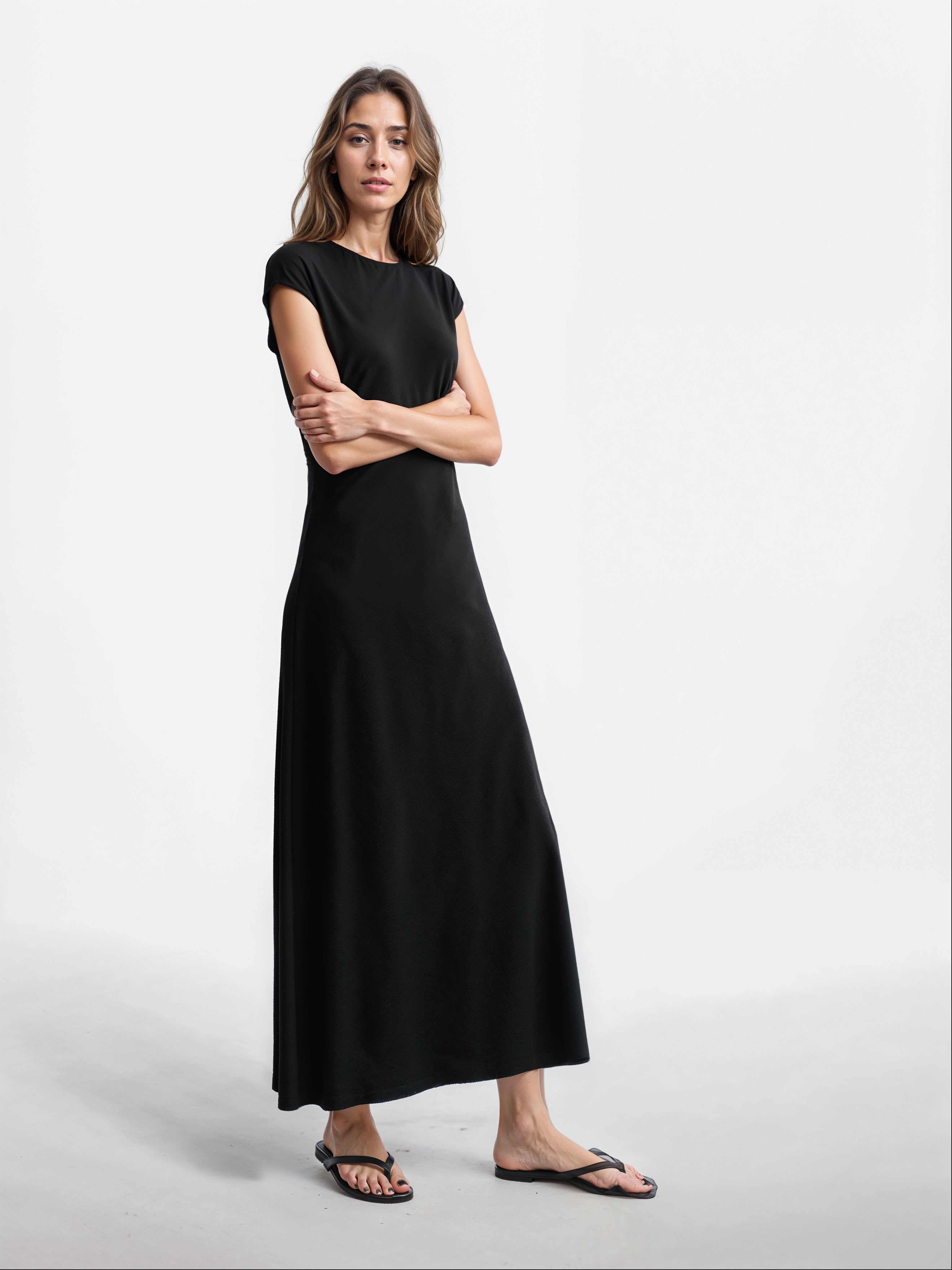 Vestido Everyday de Toteme. Confeccionado en jersey fluido negro, con corte entallado, cuello redondo, mangas cortas y largo recto hasta el tobillo. Presenta cremallera trasera oculta y jersey fluido de grosor medio con tacto seco.