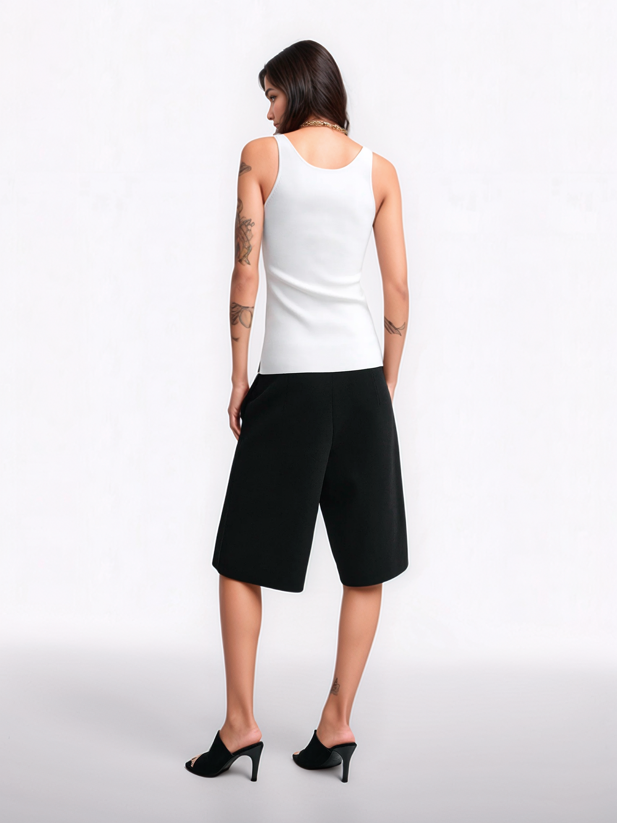 Bermudas de punto de Toteme. Confeccionadas en jersey elástico negro compacto de grosor medio, con largo hasta la rodilla y cierre frontal con gancho y cremallera oculta. Presentan cinturilla elástica y bolsillos laterales.