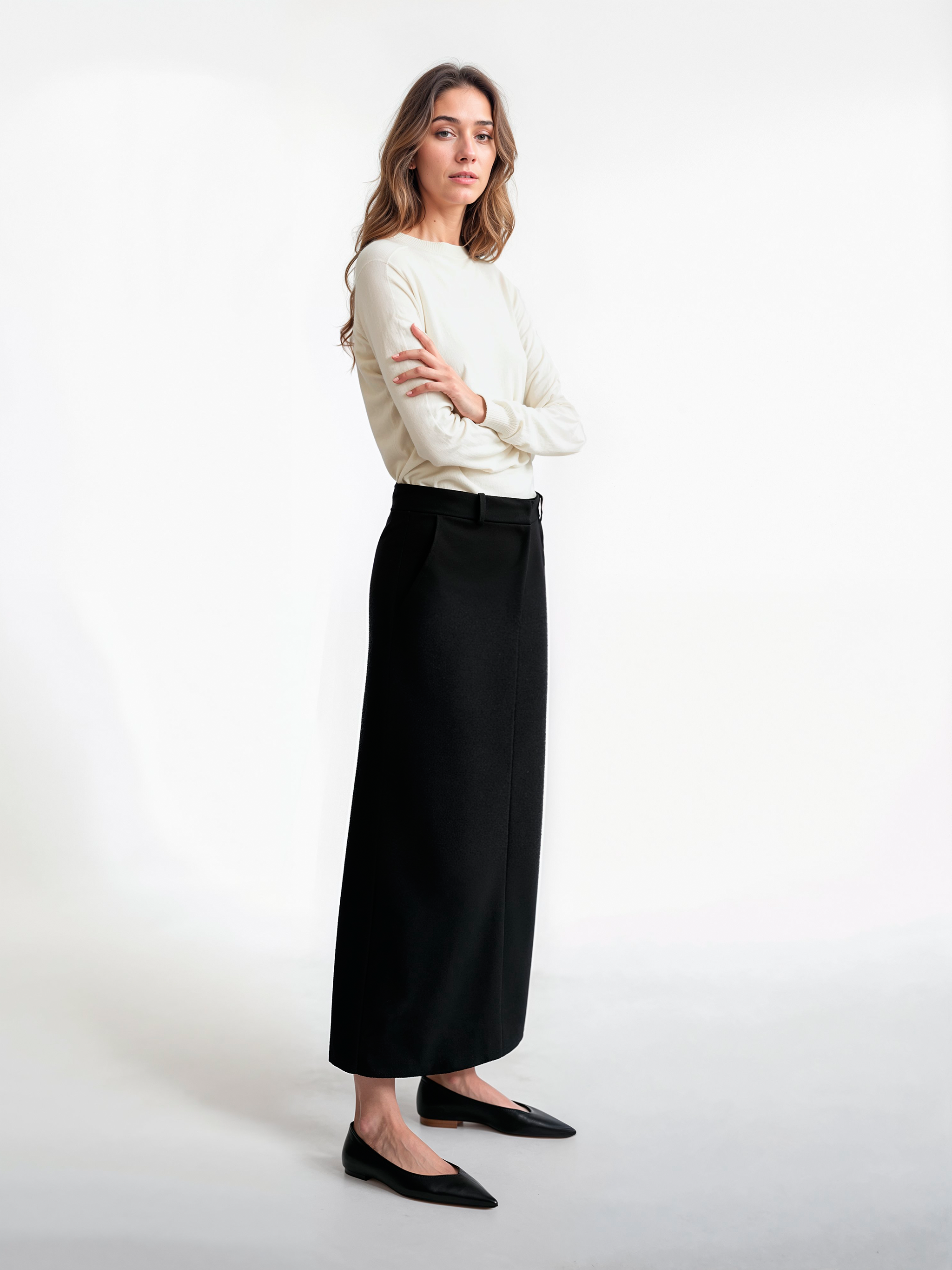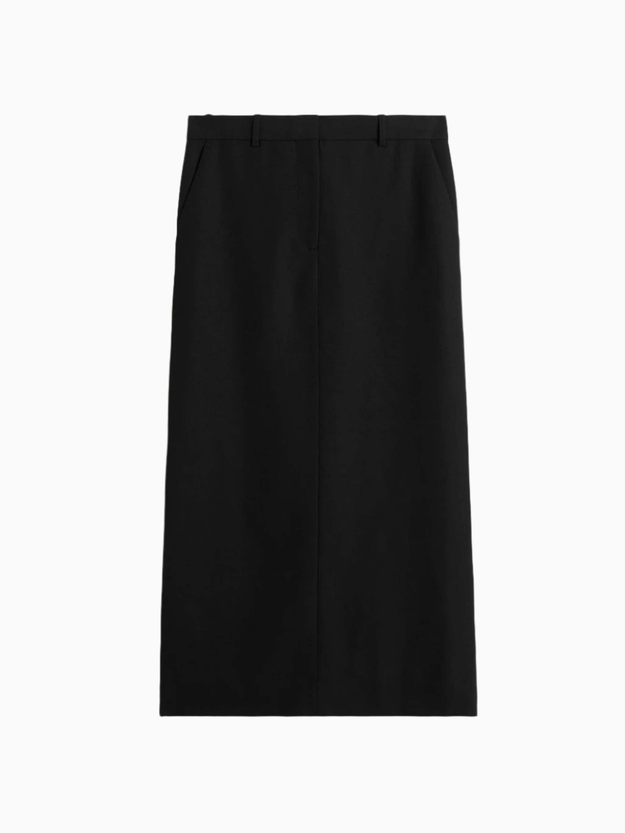 Falda midi de Toteme. Confeccionada en lona negra de la firma, con silueta larga y recta y detalles de sastrería clásicos. Presenta trabillas, cierre de botón y cremallera, bolsillos laterales y abertura trasera.