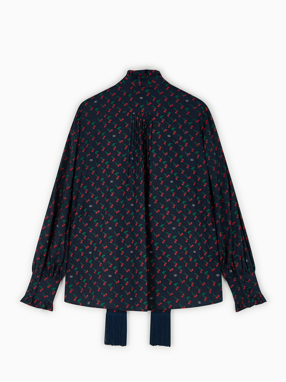 Camisa de cerezas de Valentino Garavani. Confeccionada en muselina de algodón azul marino con estampado de cerezas rojas.