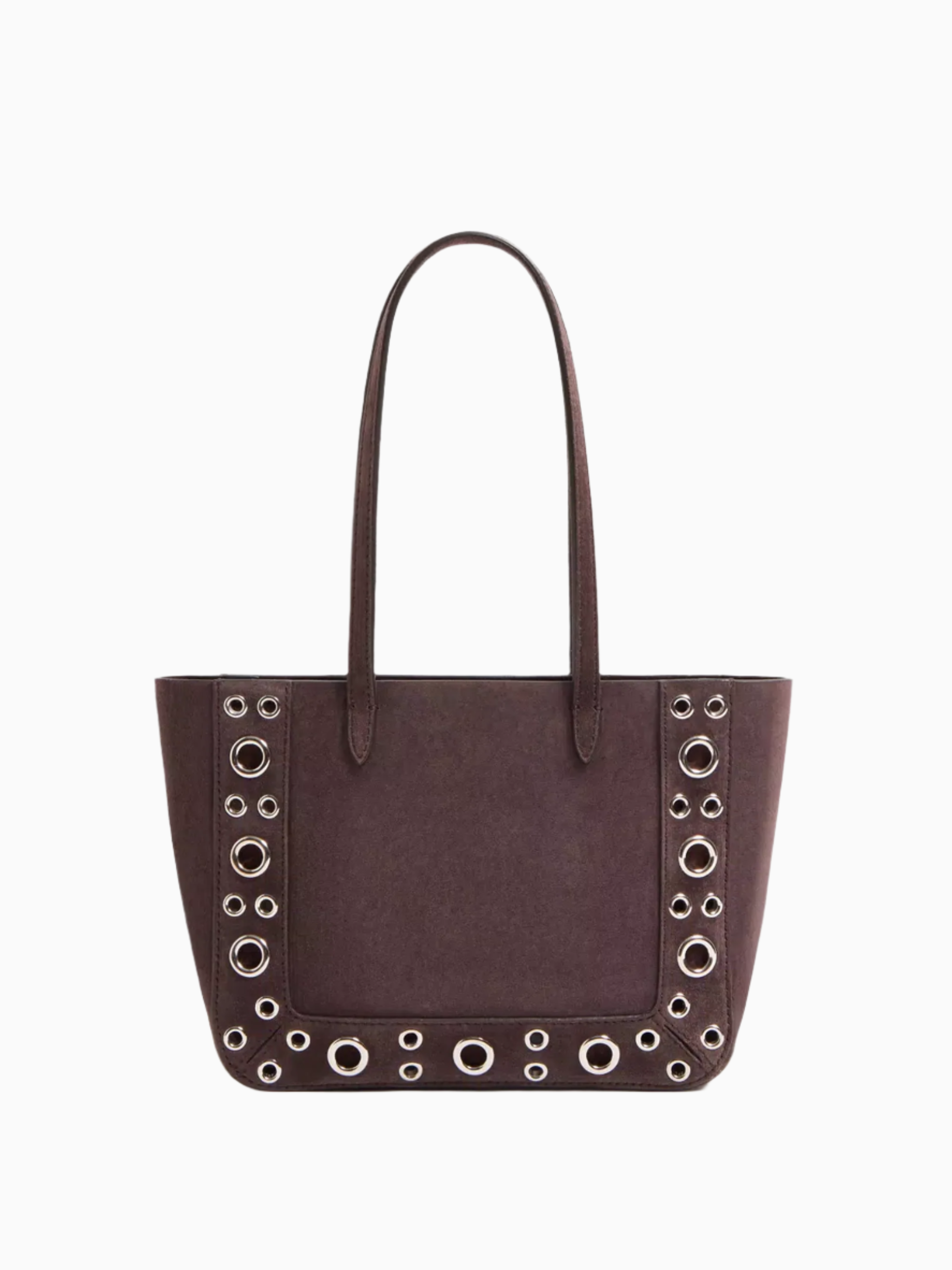 Bolso Nellcôte mini de Valentino Garavani. Elaborado en ante marrón oscuro con ribetes decorados con tachuelas y remaches. Presenta herrajes con acabado paladio, un pequeño detalle metálico con la firma Vlogo y un bolsillo interior con cremallera.