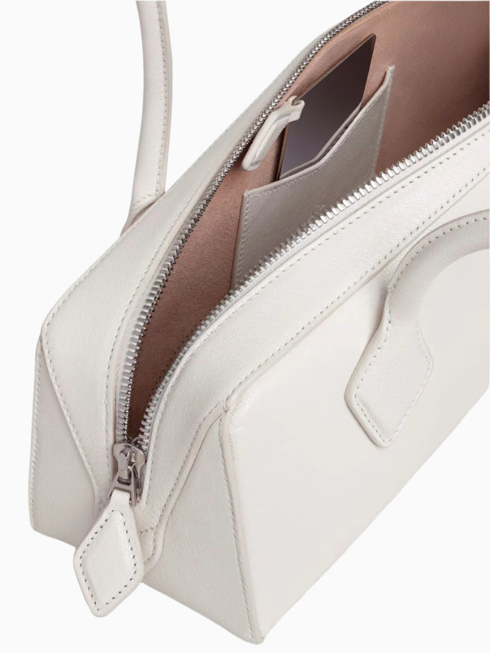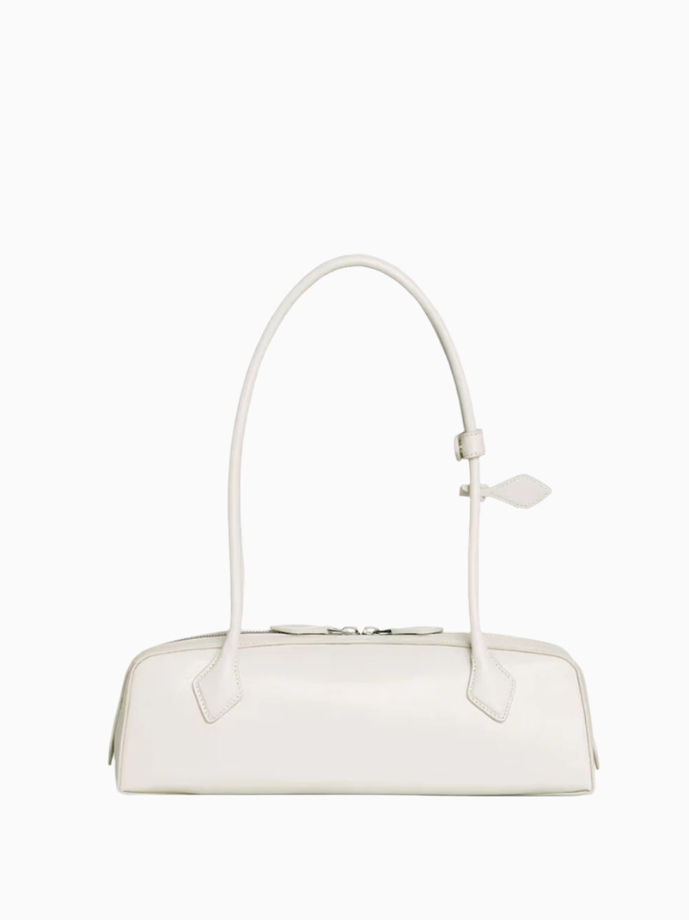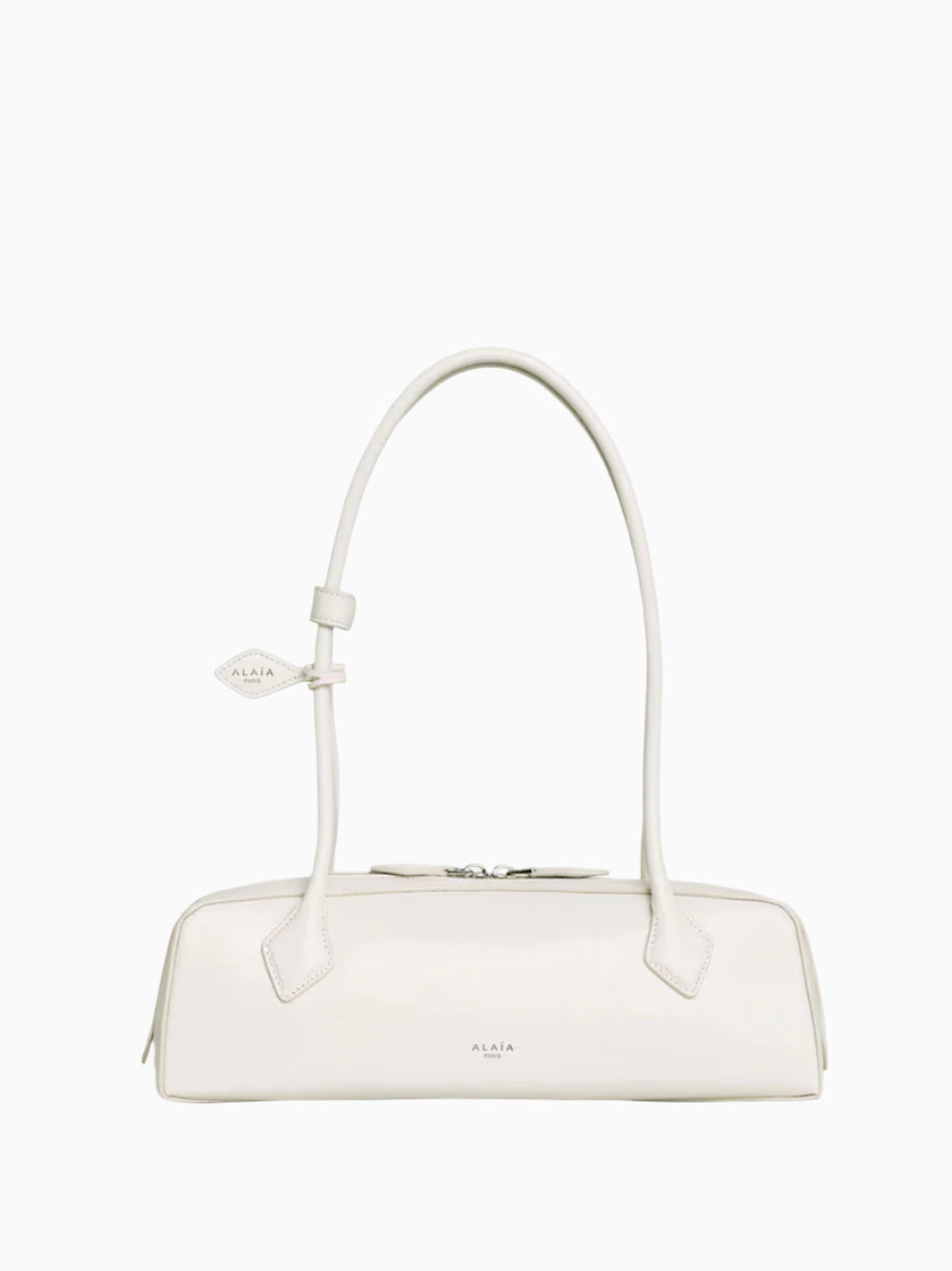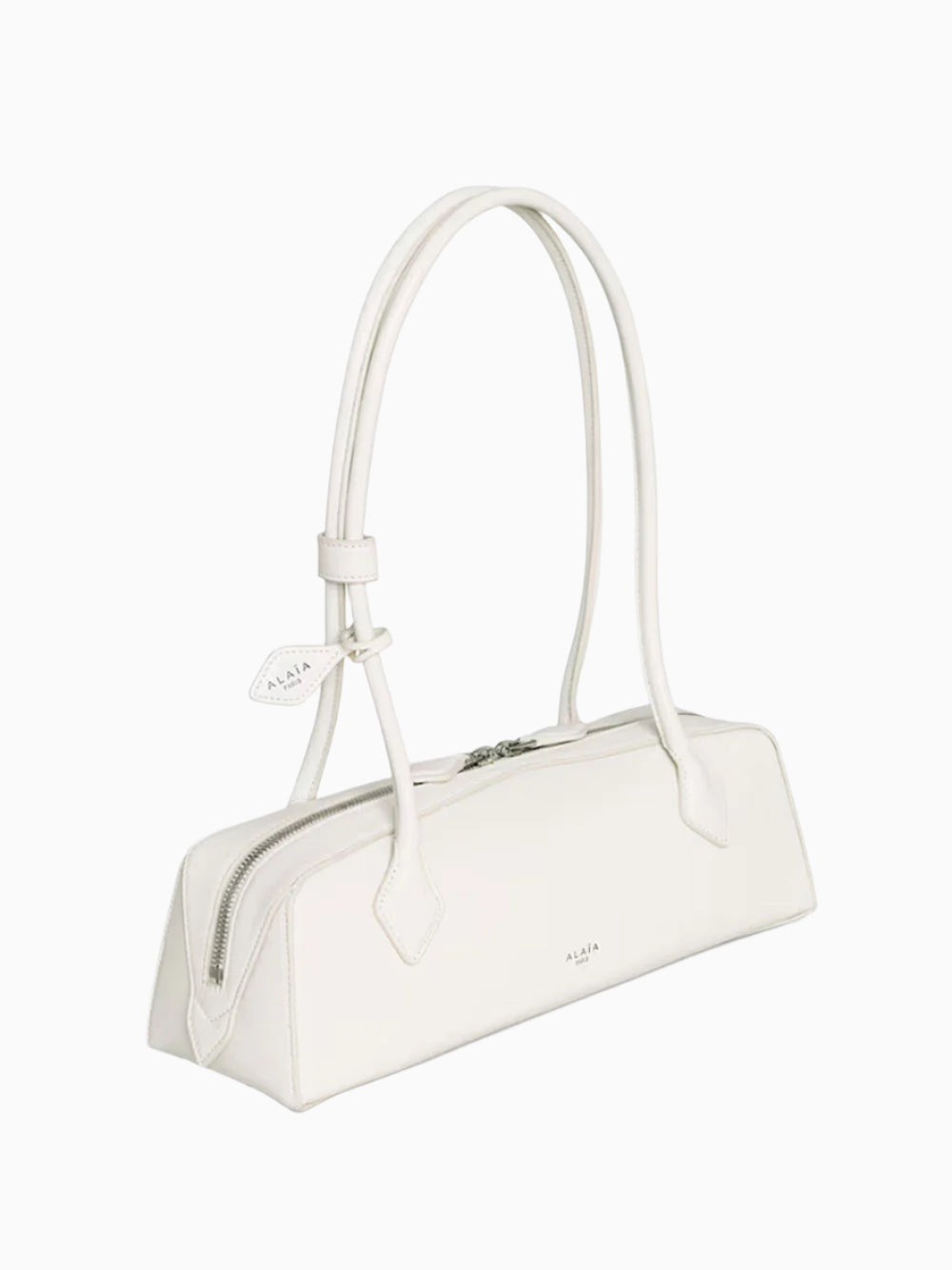 Alaïa Le Teckel medium bag. Crafted in ivory white leather with an elongated shape, tubular handles with two decorative ties and double zip fastening. Featuring shoulder carry and a small removable mirror in the inside pocket.