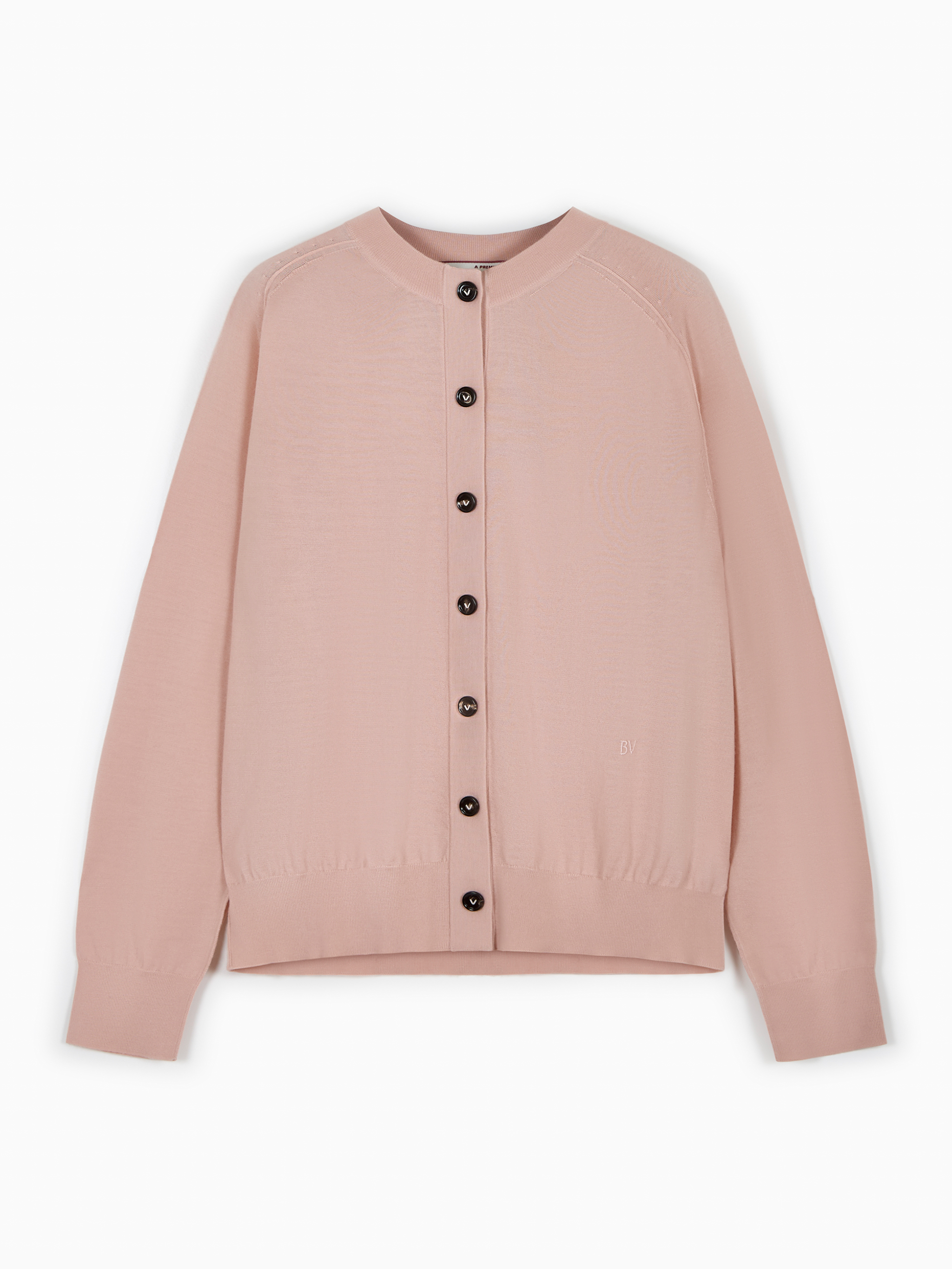 Bottega Veneta cashmere cardigan. Crafted in light pale pink cashmere with a boxy neck and contrasting buttons.