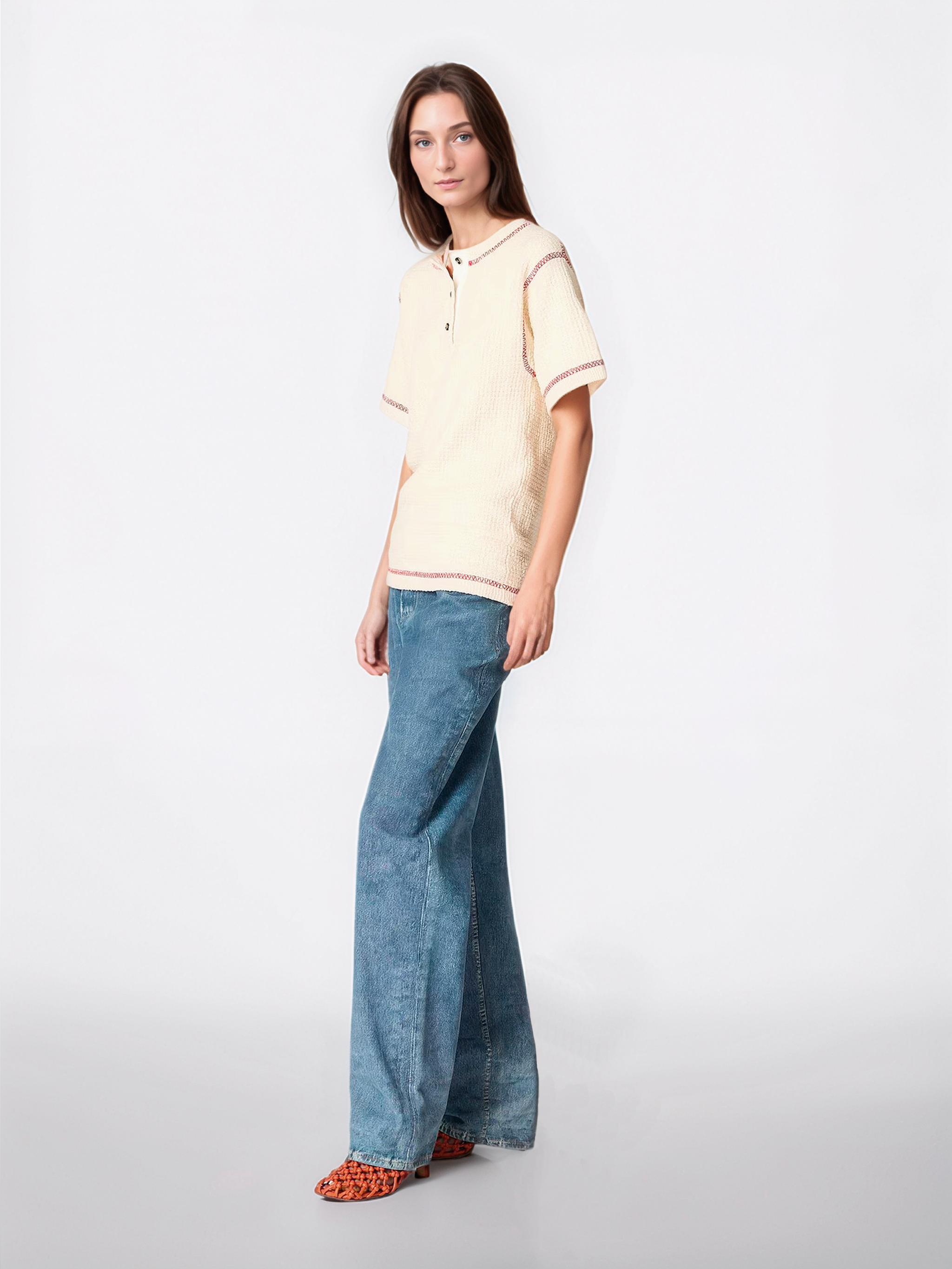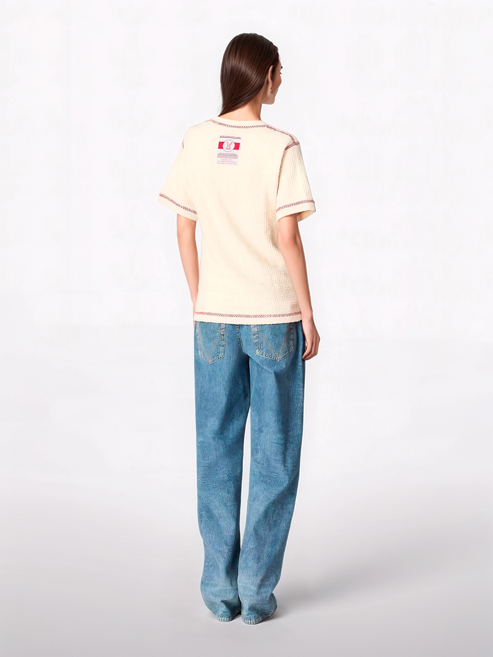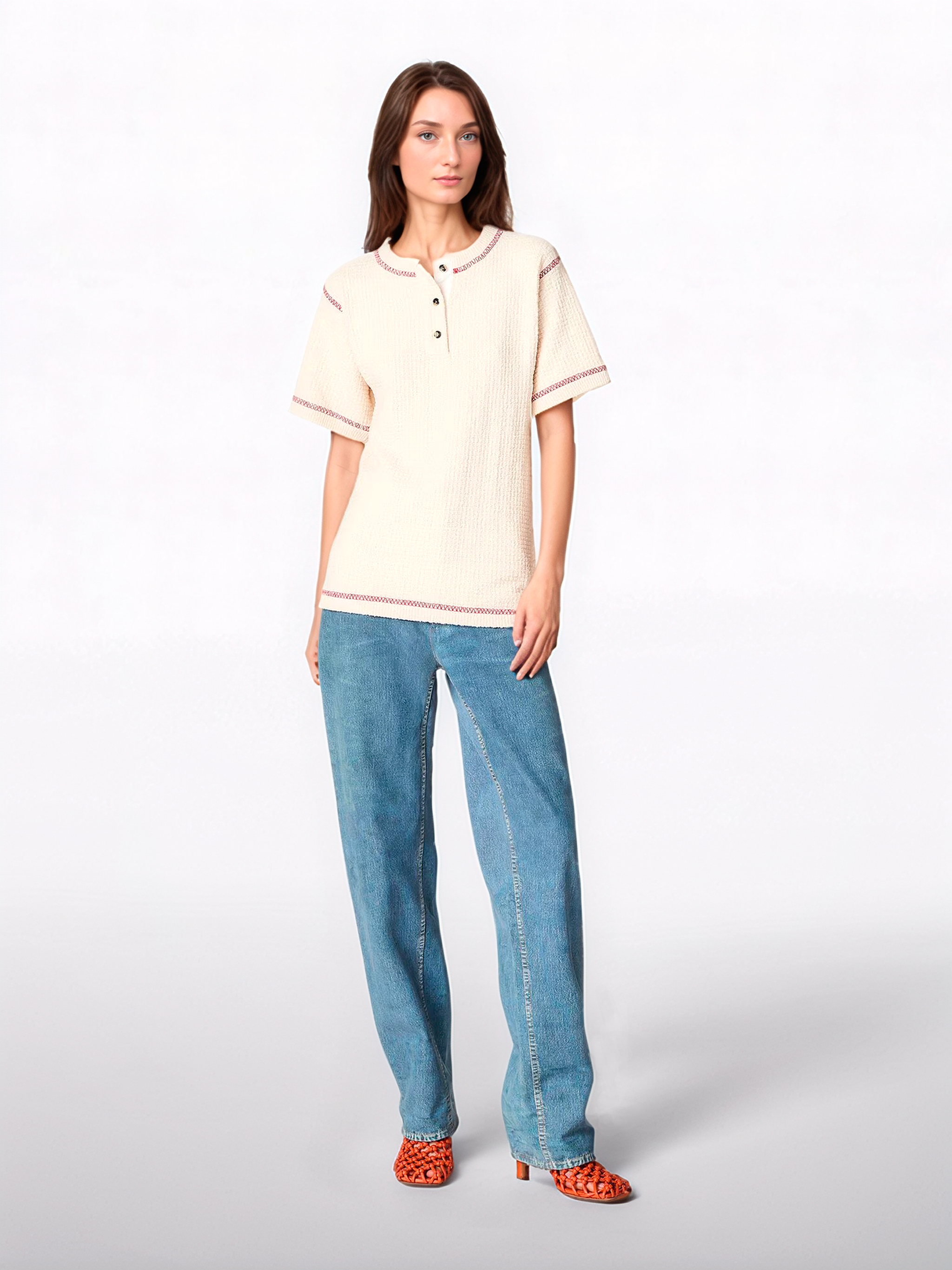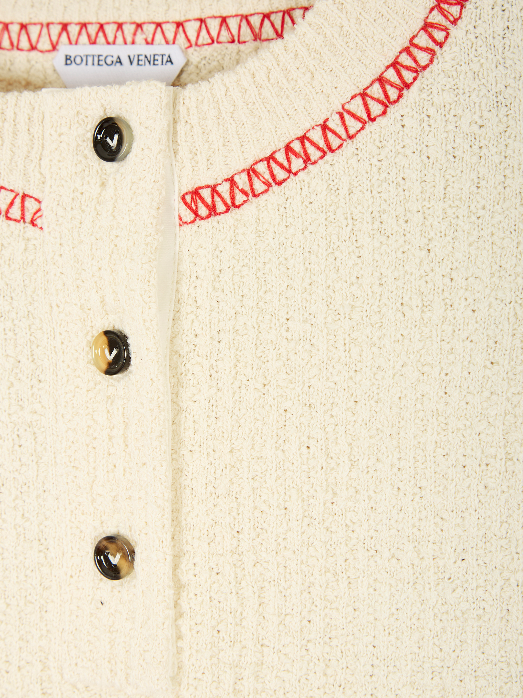 Bottega Veneta cotton waffle t-shirt. Crafted in midweight chalk-toned cotton waffle with a regular fit, neck button fastening and red contrasting stitching.