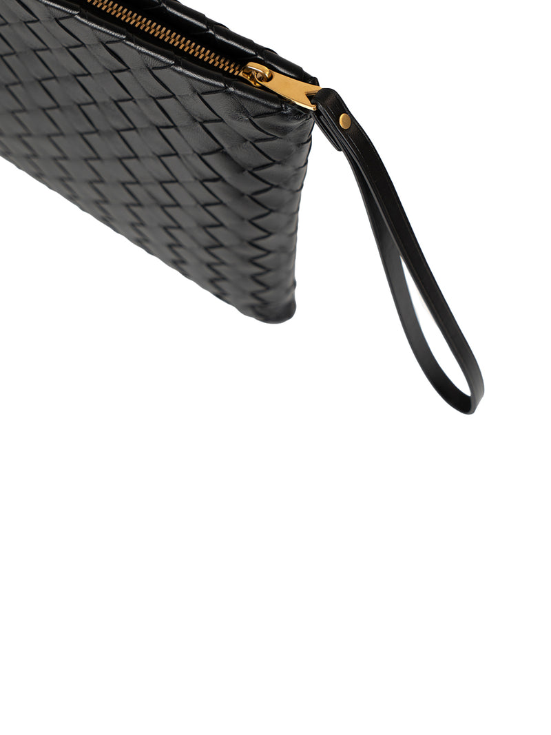 Bottega Veneta black nappa leather pouch with mini Intreccio design finished with gold-toned hardware and top zip-fastening with leather pull.