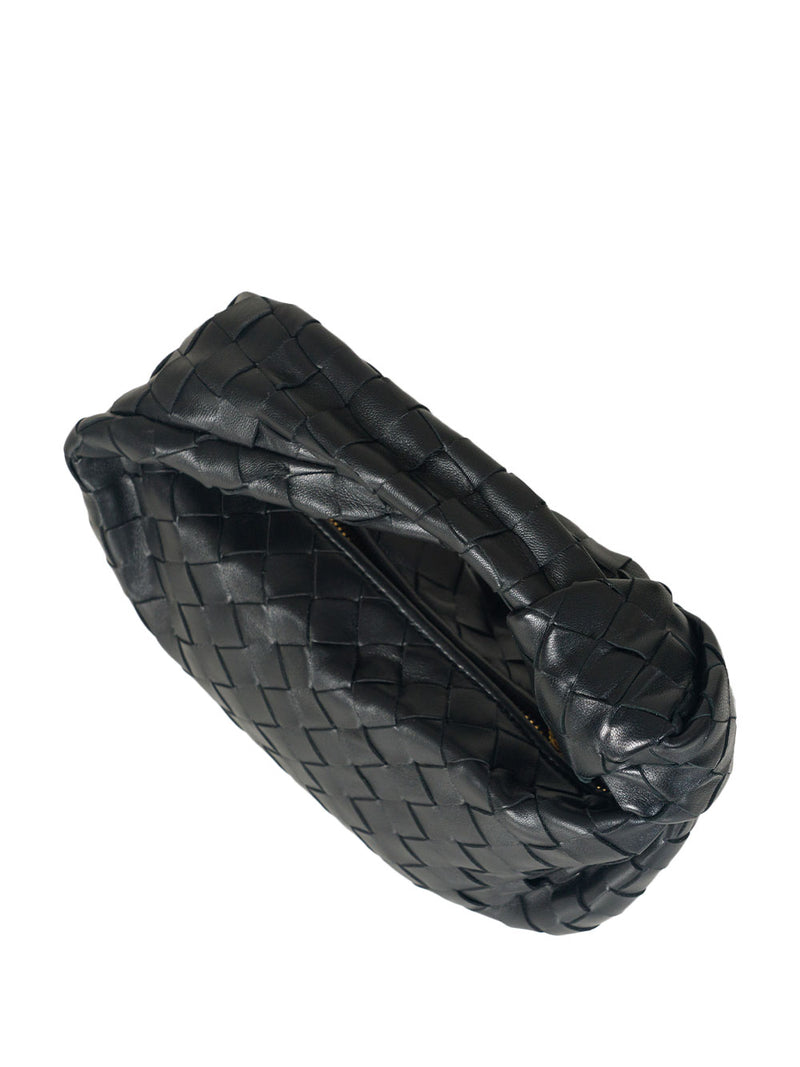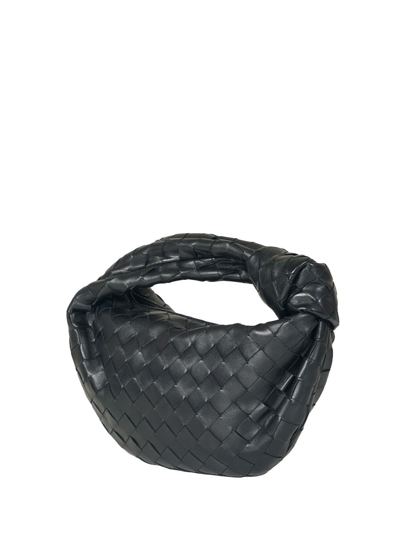 Bottega Veneta intrecciato leather minibag in black with knotted top handle. The bag features single compartment with zipper closure and gold-tone hardware.