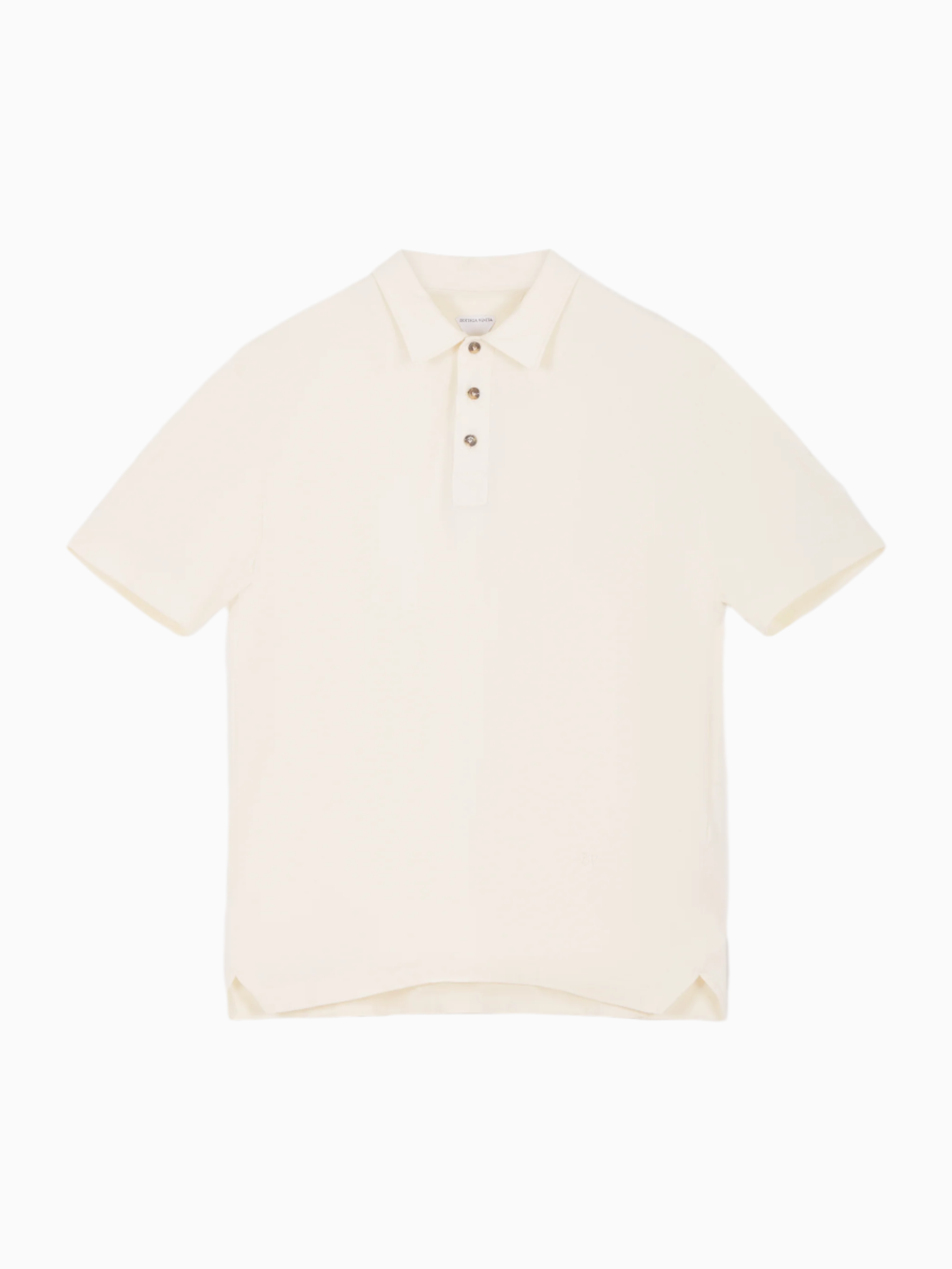 Bottega Veneta piquet polo shirt. Crafted in pale meringue fine cotton jersey with a regular fit, short sleeves and a polo neck.