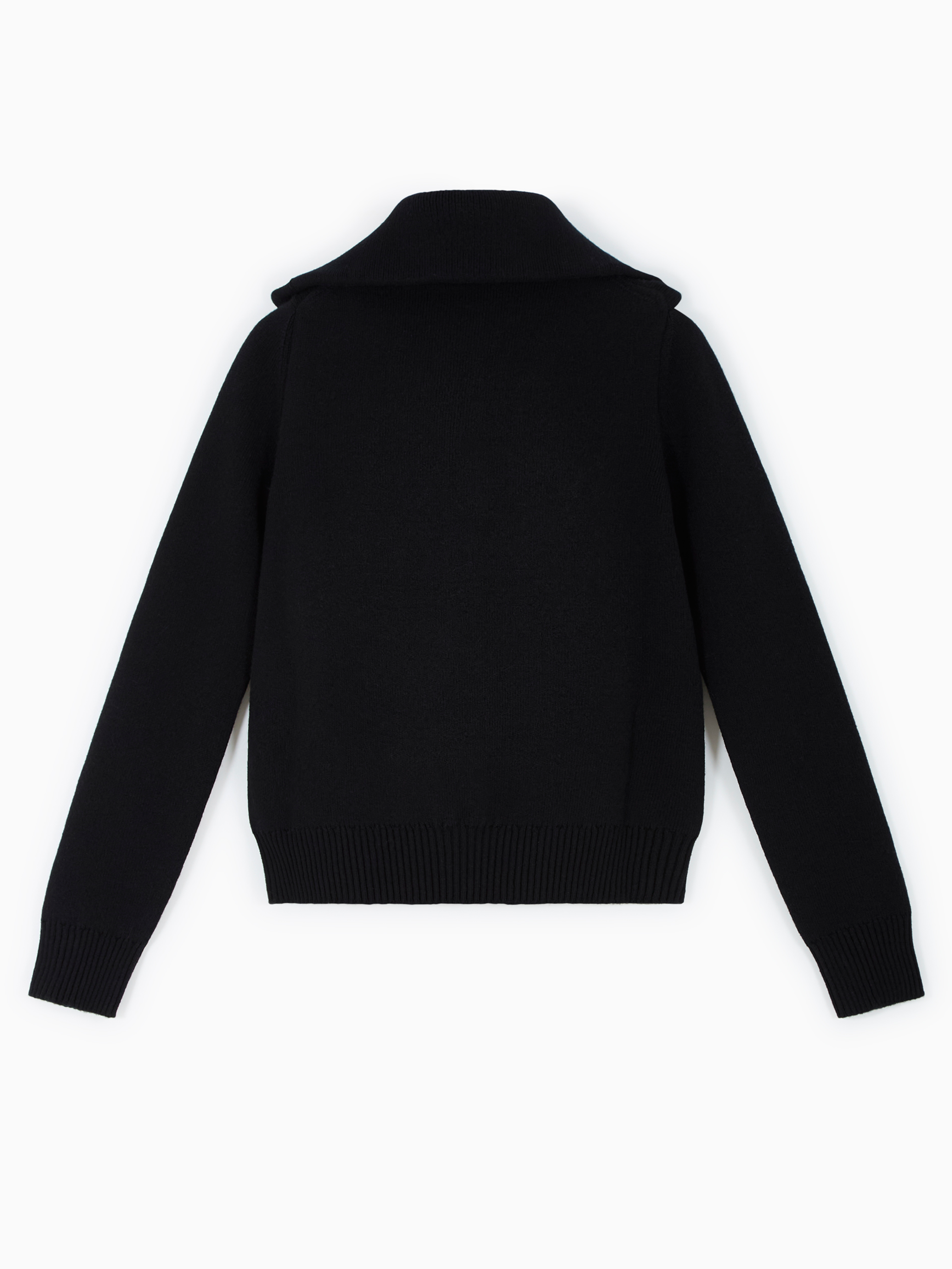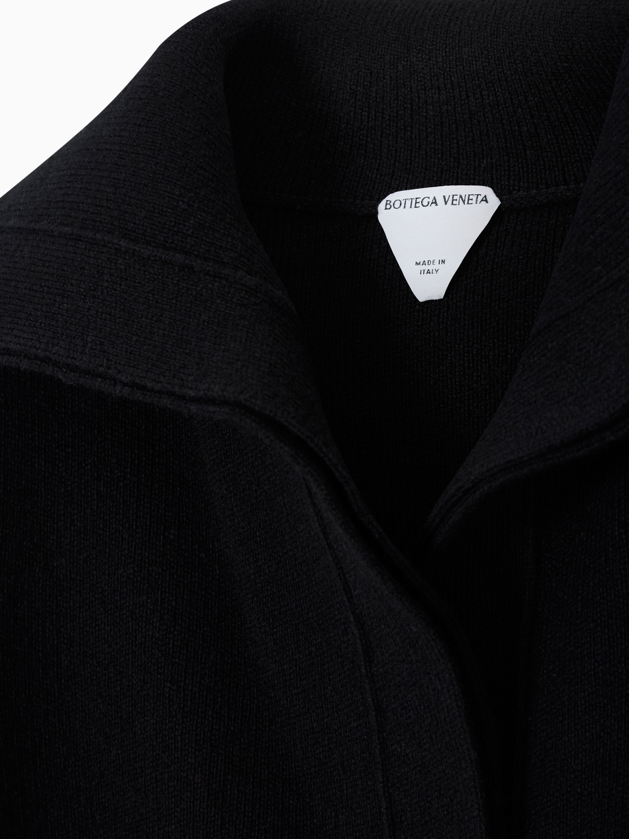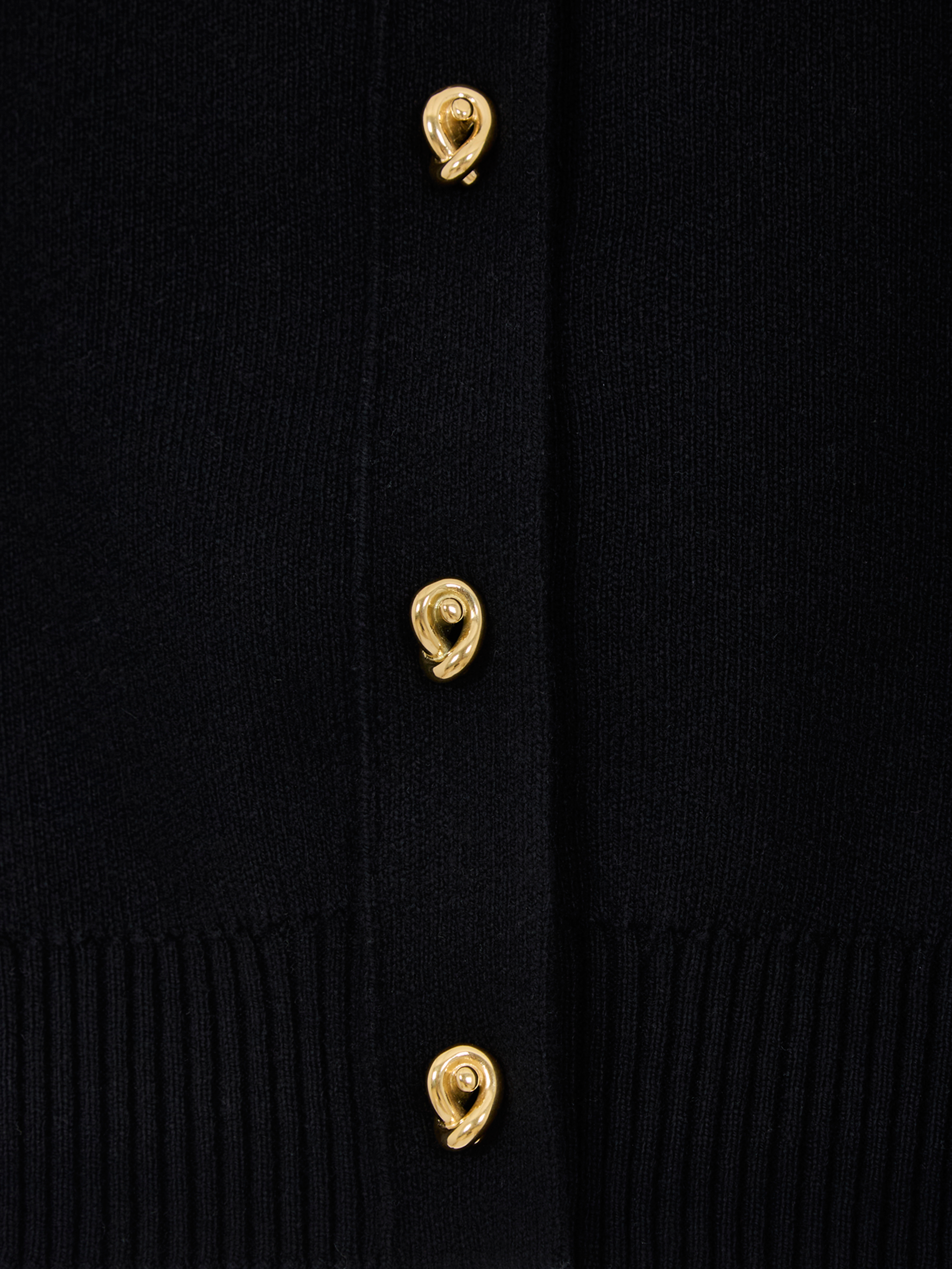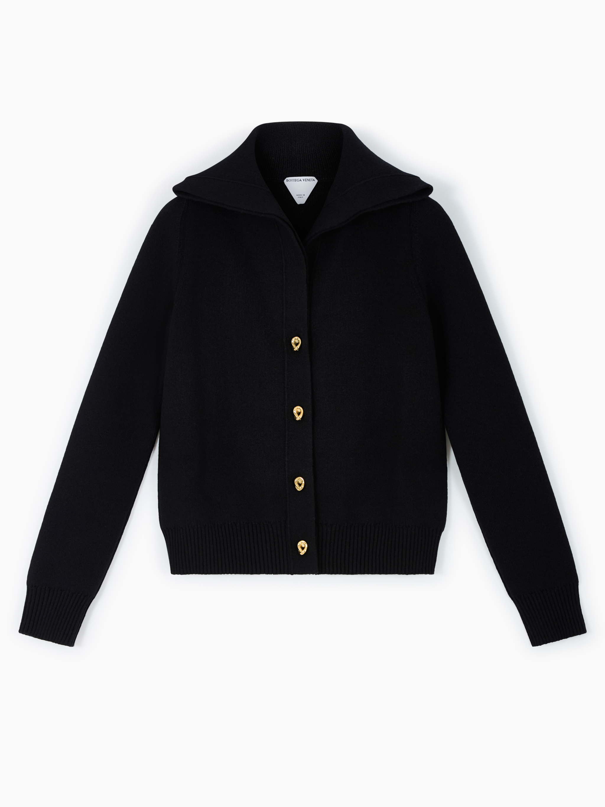 Bottega Veneta wool cardigan. Crafted in pure black wool with a pointed collar, front buttoned fastening and gold-tone knot-shaped buttons. Featuring long sleeves, ribbed cuffs and hem, and a straight hem.